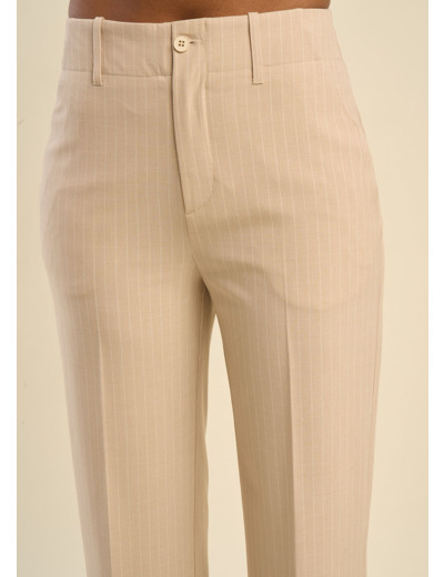 Le pantalon PILLY, l’allié parfait de la femme moderne. Avec sa coupe large et sa taille haute, il allonge la silhouette tout en offrant un confort optimal. Ses poches italiennes et sa poche passepoilée au dos ajoutent une touche d’élégance et de praticité. Son tissu à fines rayures écrues sur fond beige apporte une note subtile et raffinée. Associez-le à la veste VARIA ou au gilet GARIA pour un look urbain et sophistiqué.