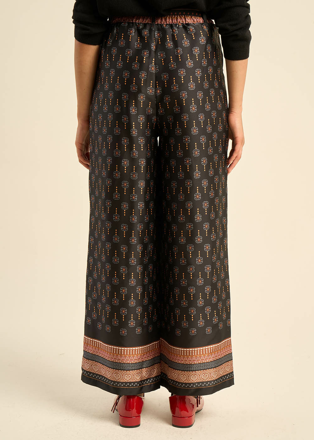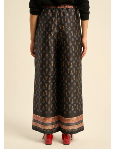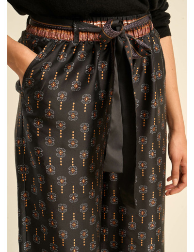 Le pantalon PATNA, conçu en satin polyester fluide et léger, sublime votre silhouette avec élégance. Il reprend le motif délicat de la chemise CATNA, assurant une harmonie raffinée. Sa taille élastique et ses poches italiennes ajoutent une touche pratique tout en conservant une allure sophistiquée. Parfait pour une soirée ou un look de working-girl, ce pantalon vous accompagnera avec style dans toutes vos aventures.
