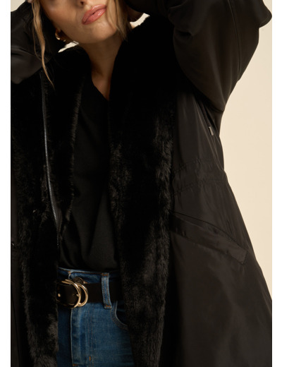 La parka MEXICO est une pièce polyvalente et élégante avec un design réversible. Un côté est en nylon uni, tandis que l'autre présente une fausse fourrure élégante. Elle est dotée d'une capuche avec un lien de serrage pour un ajustement personnalisé et d'une coulisse à la taille pour ajuster la coupe selon vos préférences. La parka comprend également deux poches zippées inclinées à l'avant pour un rangement pratique.