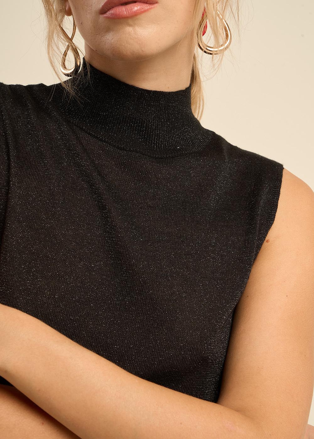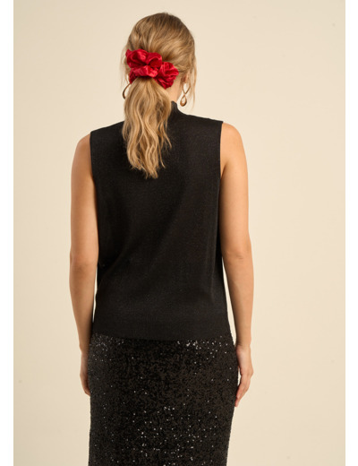 MILY, le pull sans manches qui illuminera votre hiver. Confectionné dans un mélange de fils doux et de lurex scintillant, il apporte une touche de lumière à toutes vos tenues. Son col montant, souligné d'un bord-côte, assure un confort optimal. À porter par-dessus une chemise pour un look à la fois chic et décontracté.