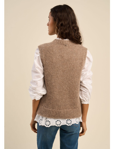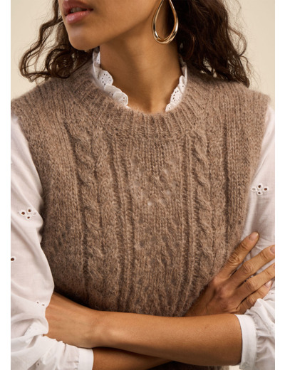 Le pull sans manches MEDUSA est une pièce intemporelle qui allie douceur et sophistication. Confectionné dans un mélange noble de mohair et d'alpaga, il se distingue par son tricot torsadé enrichi de détails ajourés, apportant une subtile touche de féminité. Son encolure ronde et ses bords côtes au col, à la base et sur les emmanchures assurent une finition élégante et soignée. Parfait pour être porté en superposition sur une chemise ou un haut texturé, ce pull offre une allure moderne et chic.