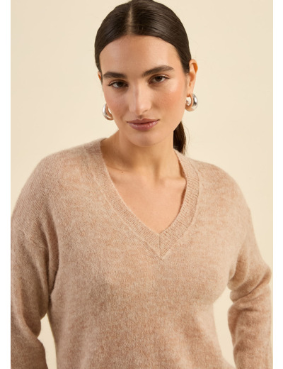 Le pull MARTINY est conçu pour offrir un mélange parfait de chaleur et de confort. Avec son col en V, ses épaules tombantes et sa forme ample, il apporte une touche de décontraction élégante à votre garde-robe. Ce modèle en moyenne jauge, aux manches longues et à l'effet mohair, se distingue par son tricotage doux et enveloppant. Portez-le avec un pantalon de tailleur pour une allure sophistiquée ou associez-le à un jean pour un look décontracté et confortable.