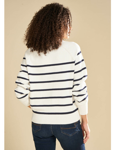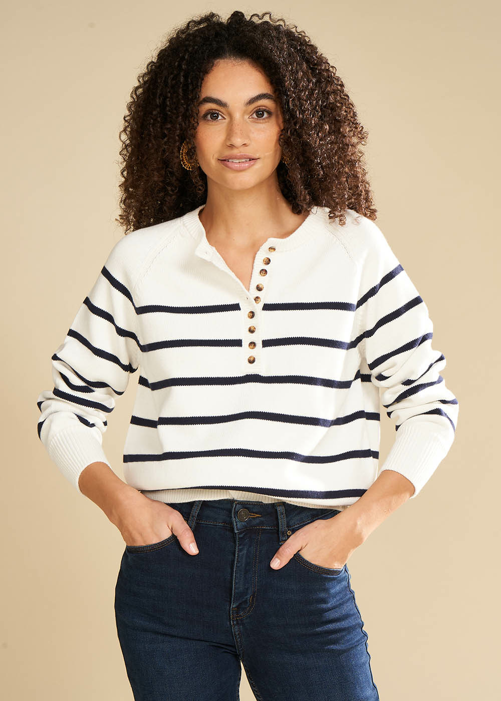 Le pull marinière MELSYA se distingue avec son col rond et ses manches raglans. Il est doté d'une demie patte de boutonnage sur le milieu devant avec des boutons écaille ajoutant une touche élégante. Associez-le à votre jean préféré pour un look décontracté ou à une jupe en satin pour une allure plus chic.