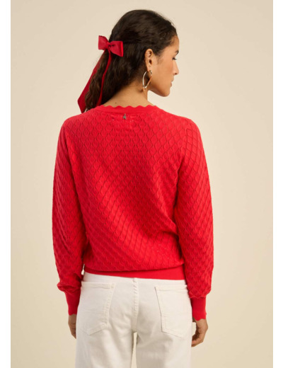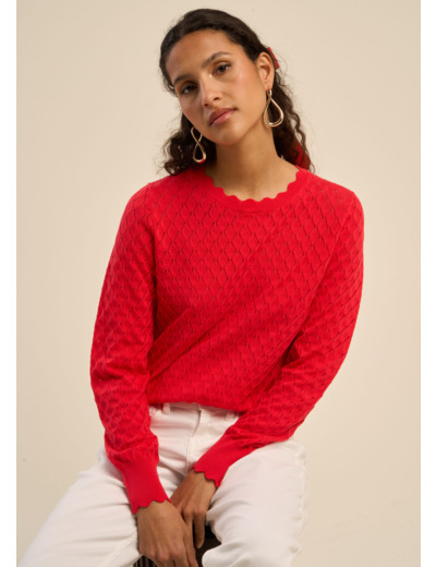 Ce pull se distingue par ses détails délicats et raffinés, tels que les bords festonnés qui ornent subtilement le col rond et les manches longues.