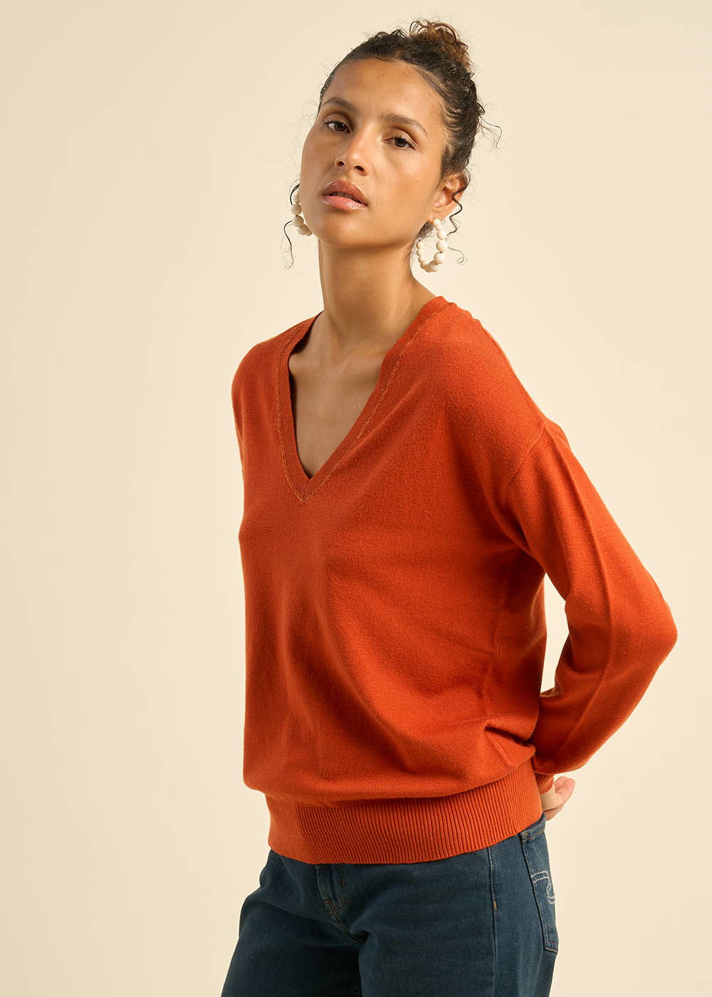 MARSENANO, le pull en viscose qui allie douceur et élégance. Sa maille fine et fluide, associée à une forme ample et droite, offre un confort absolu. L'encolure en V et le jeu de tricotage sur les épaules apportent une touche d'originalité. Disponible dans une palette de sept couleurs, il s'adapte à tous les styles.