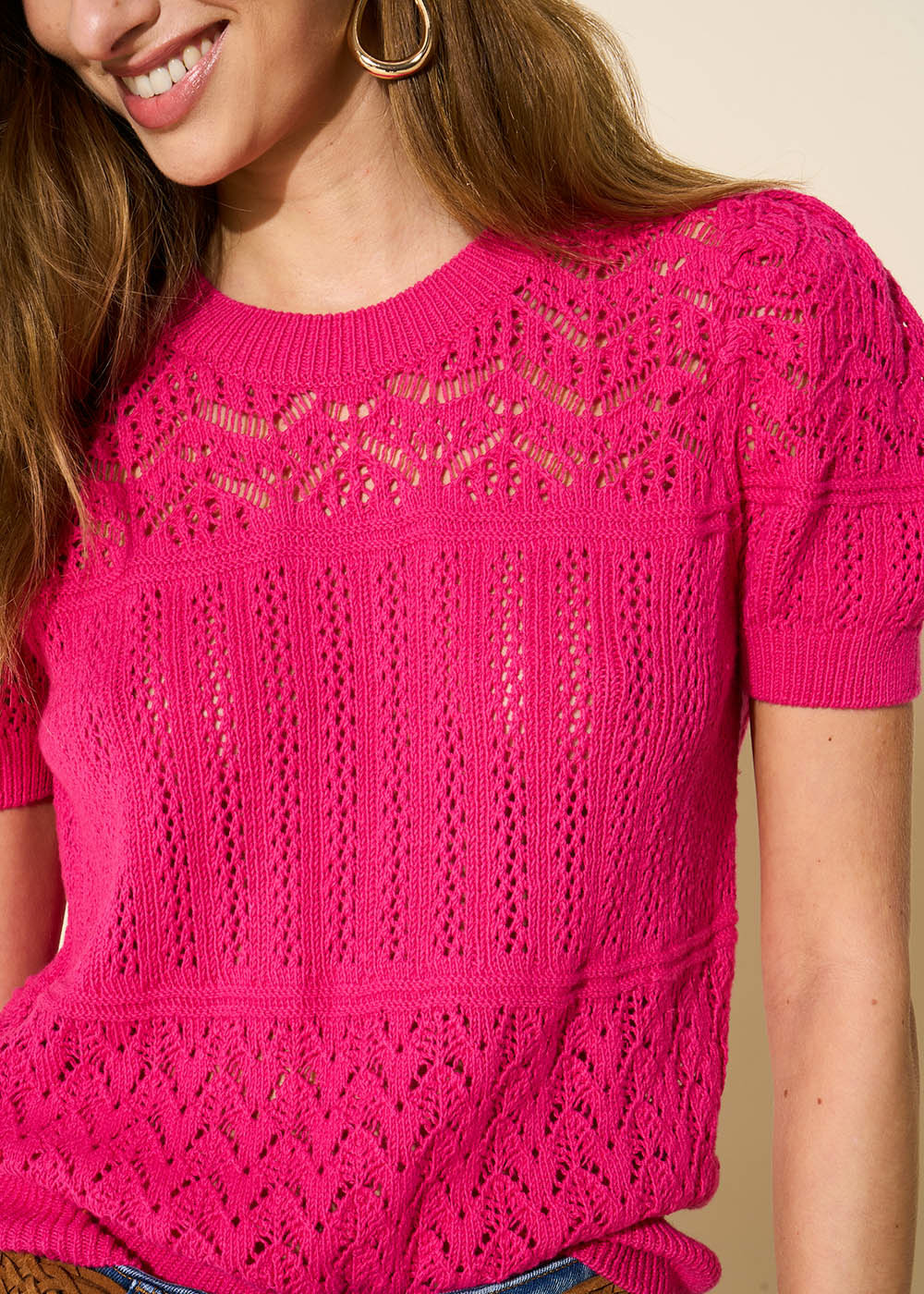 Le pull MADALOU à manches courtes est doté d'un col rond. Confectionné en coton doux il offre un confort exceptionnel tandis que son tricotage fantaisie en bandeaux apporte une touche de modernité à votre tenue. Un essentiel tendance qui allie confort et élégance avec brio.