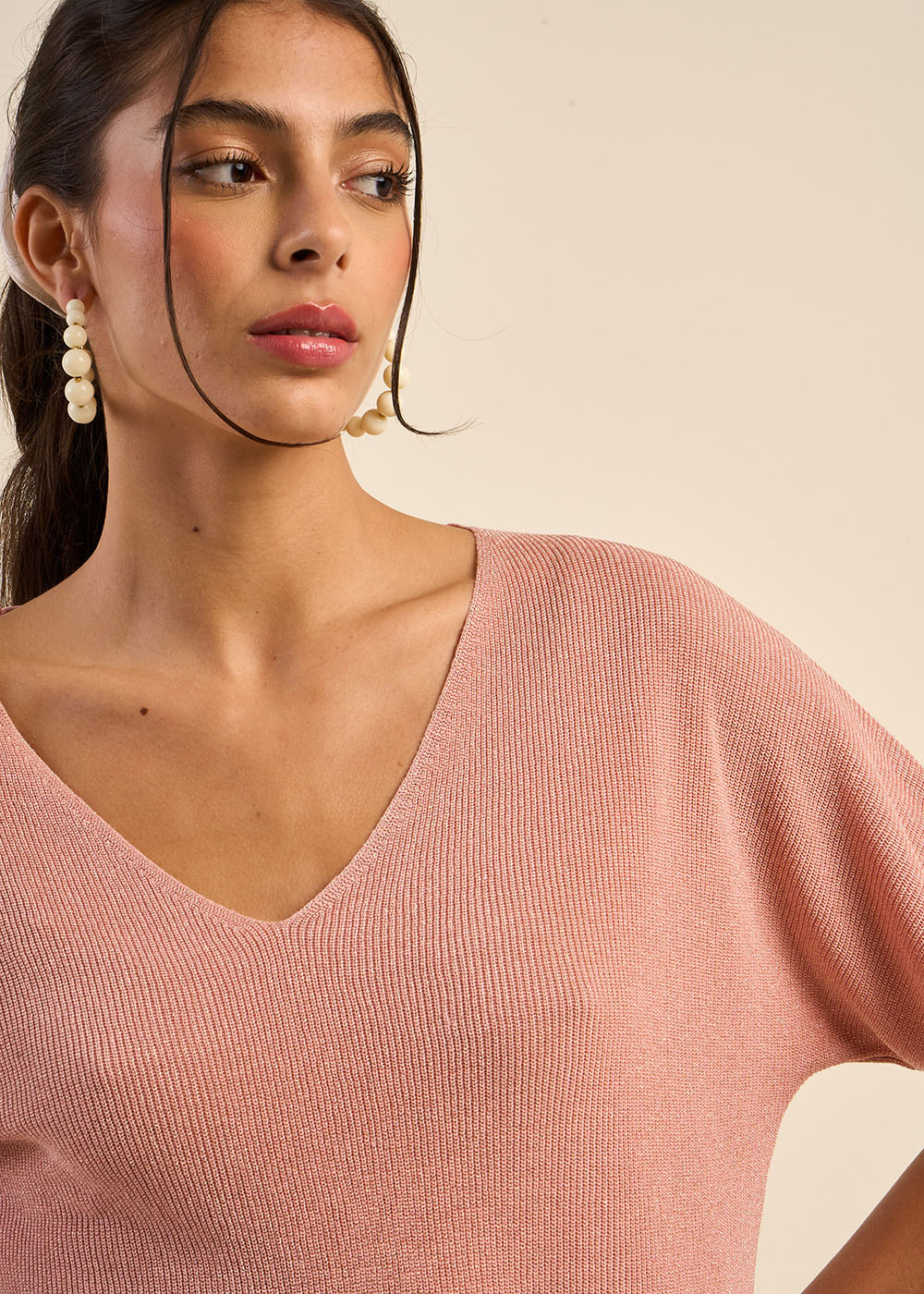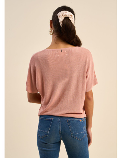 Le pull MIKOLLAYX est une pièce tendance qui allie modernité et légèreté grâce à sa coupe ample et sa matière raffinée. Confectionné en fine jauge, il séduit par son éclat subtil grâce à l'ajout de fibres métallisées. Son col V, rehaussé d’un délicat liseré en fibre métallisée, apporte une touche élégante et lumineuse. Avec ses manches courtes chauve-souris, il offre un style décontracté et chic.
