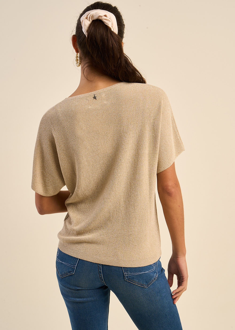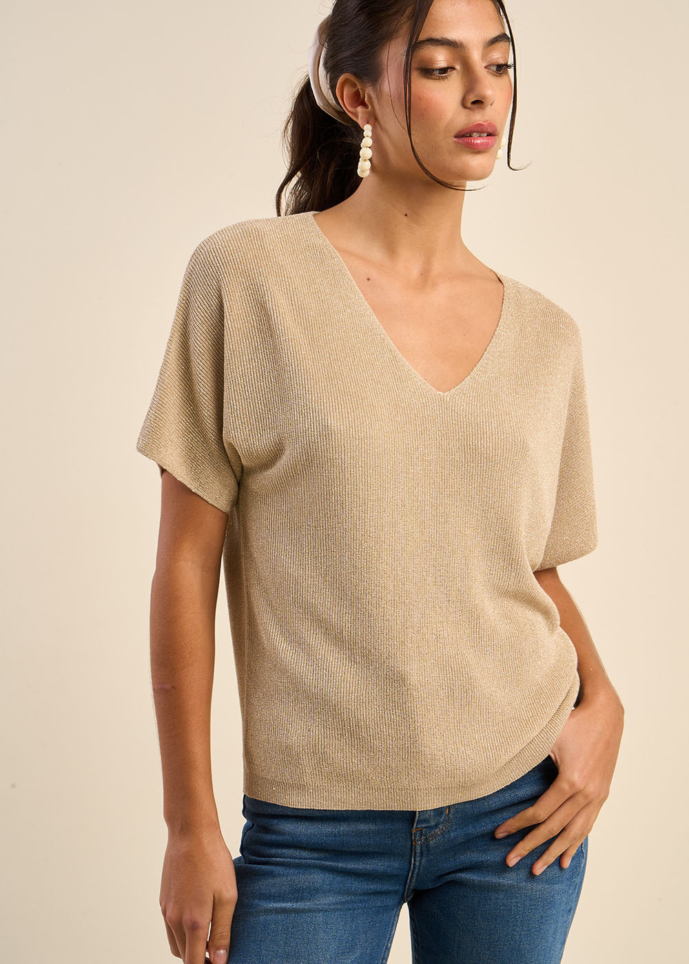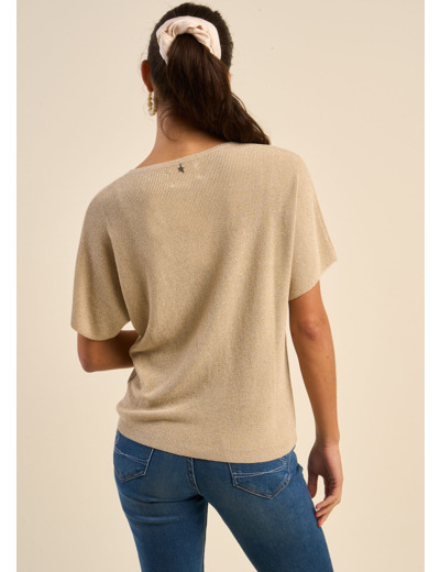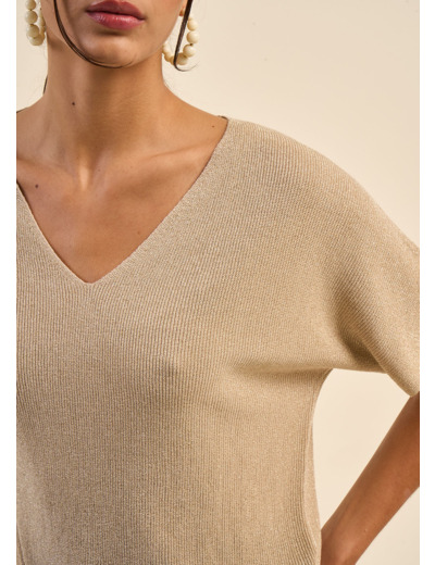 Le pull MIKOLLAYX est une pièce tendance qui allie modernité et légèreté grâce à sa coupe ample et sa matière raffinée. Confectionné en fine jauge, il séduit par son éclat subtil grâce à l'ajout de fibres métallisées. Son col V, rehaussé d’un délicat liseré en fibre métallisée, apporte une touche élégante et lumineuse. Avec ses manches courtes chauve-souris, il offre un style décontracté et chic.