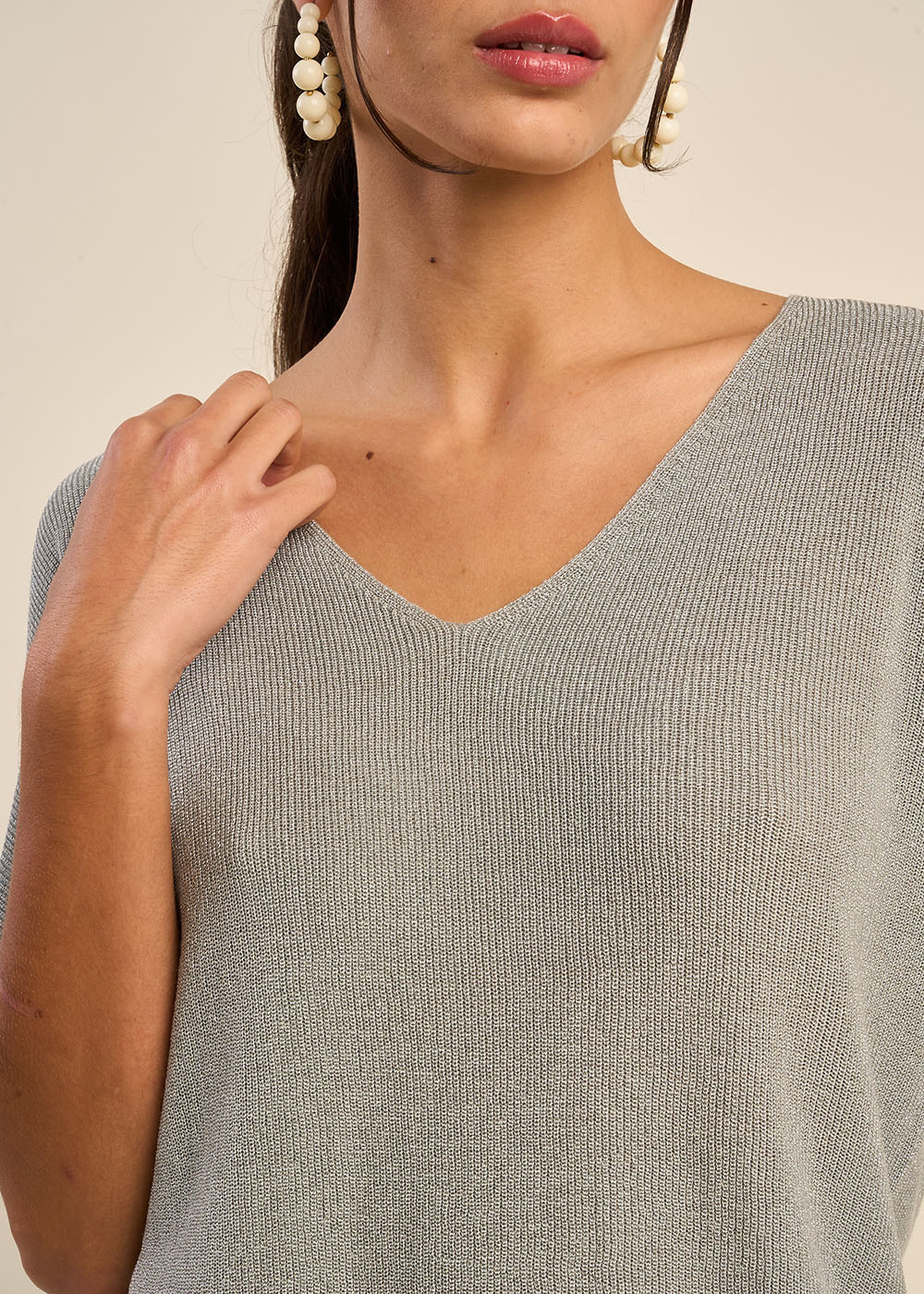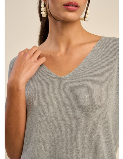 Le pull MIKOLLAYX est une pièce tendance qui allie modernité et légèreté grâce à sa coupe ample et sa matière raffinée. Confectionné en fine jauge, il séduit par son éclat subtil grâce à l'ajout de fibres métallisées. Son col V, rehaussé d’un délicat liseré en fibre métallisée, apporte une touche élégante et lumineuse. Avec ses manches courtes chauve-souris, il offre un style décontracté et chic.