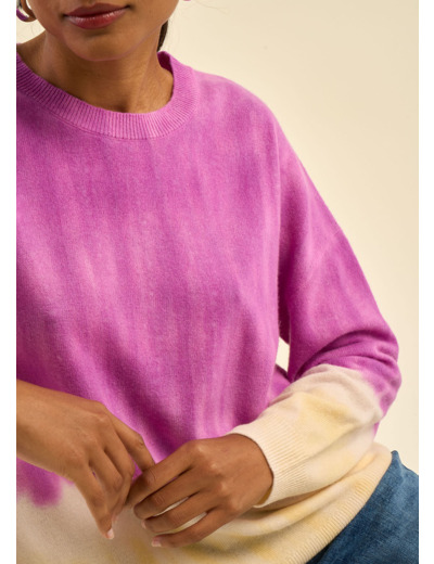 Le pull MALOUYA, en cachemire, se distingue par son imprimé tie-and-dye audacieux, qui lui confère une allure moderne et tendance. Avec ses manches longues et son col rond, il offre une silhouette féminine et intemporelle. Les bord-côtes présents aux manches, au col et à la base resserrée ajoutent une touche de structure et de sophistication à ce modèle