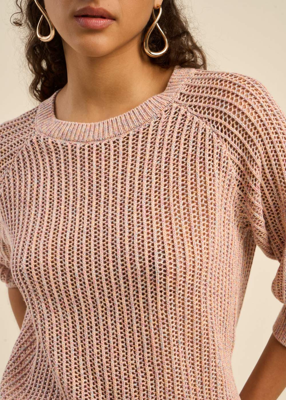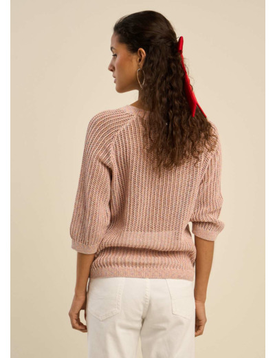 Le pull MATRO se caractérise par sa coupe droite et ses manches 3/4, offrant un look moderne et confortable. L'emmanchure raglan assure une coupe fluide et une grande aisance de mouvement. Sa maille ajourée et sa jauge fine apportent légèreté et fraîcheur, tandis que les fils multicolores mélangés ajoutent une touche de couleur subtile pour un effet raffiné et dynamique. Une pièce idéale pour allier style et confort au quotidien.