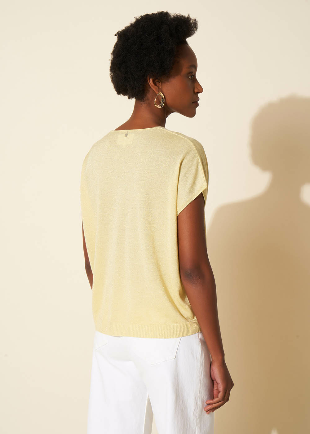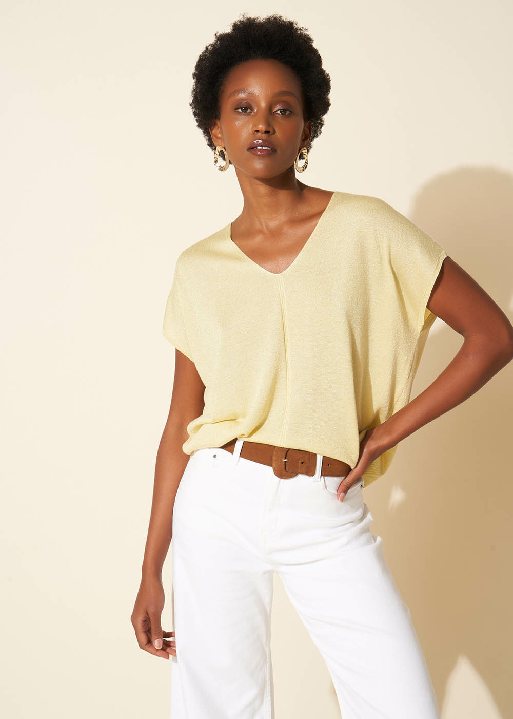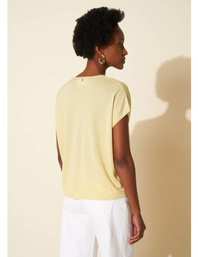 MARGARET est un pull sans manches qui se distingue par ses bords côtelés son décolleté en V et son rendu scintillant grâce à l'utilisation de fibres métallisées. Il se porte aussi bien seul que superposé permettant une diversité de looks.