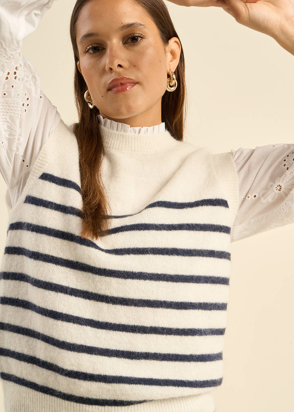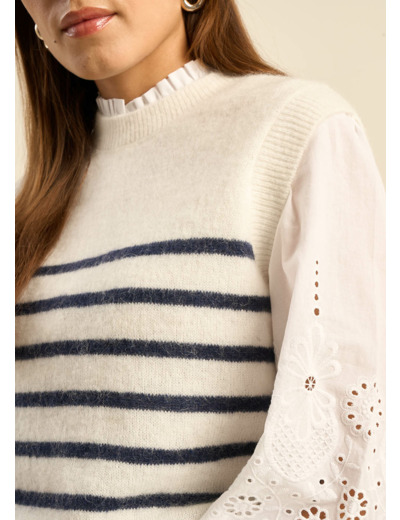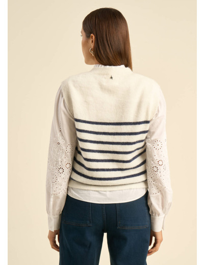 Découvrez le pull sans manches MARTO, parfait pour compléter vos tenues avec style. Il présente un col rond classique et des détails côtelés aux bordures. Orné de rayures bleues sur fond blanc, il est idéal sur une chemise pour un look chic.