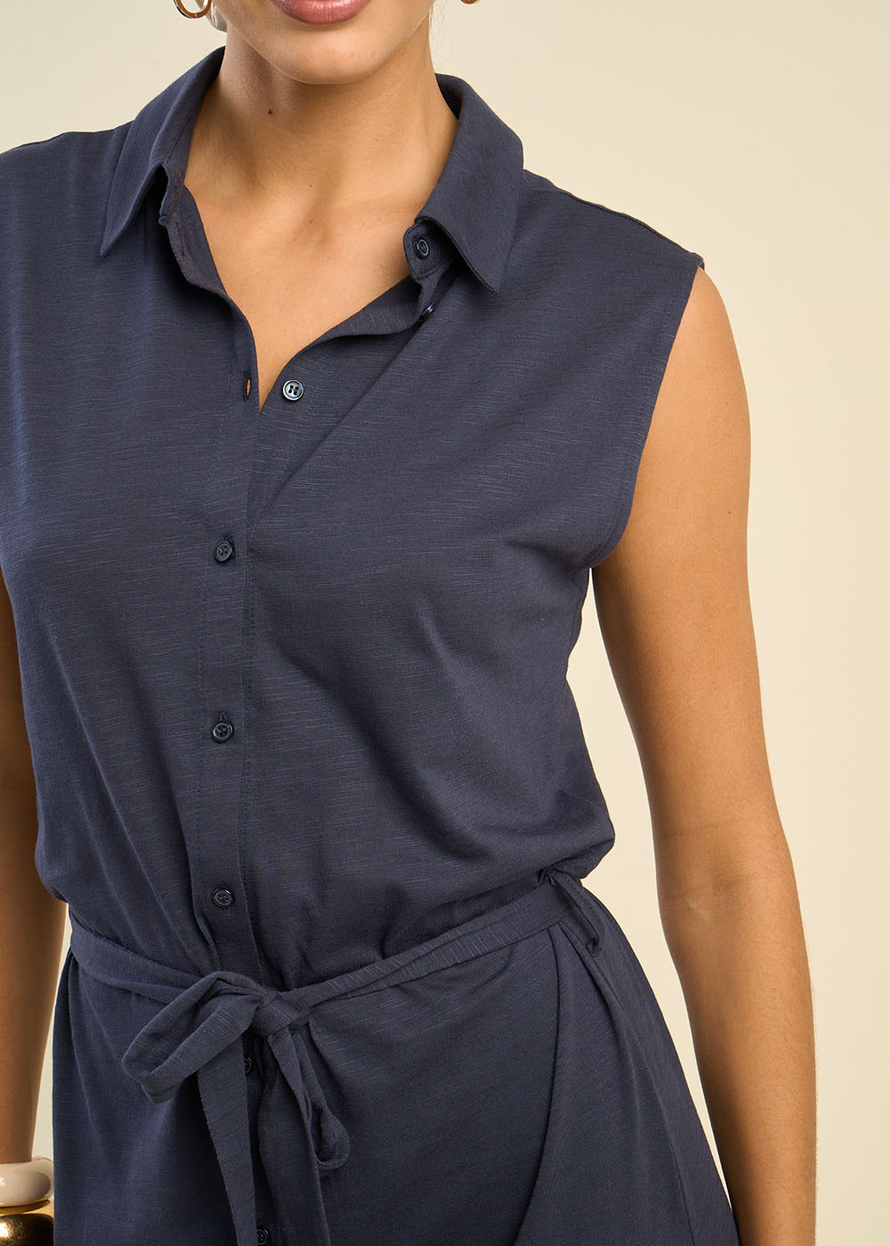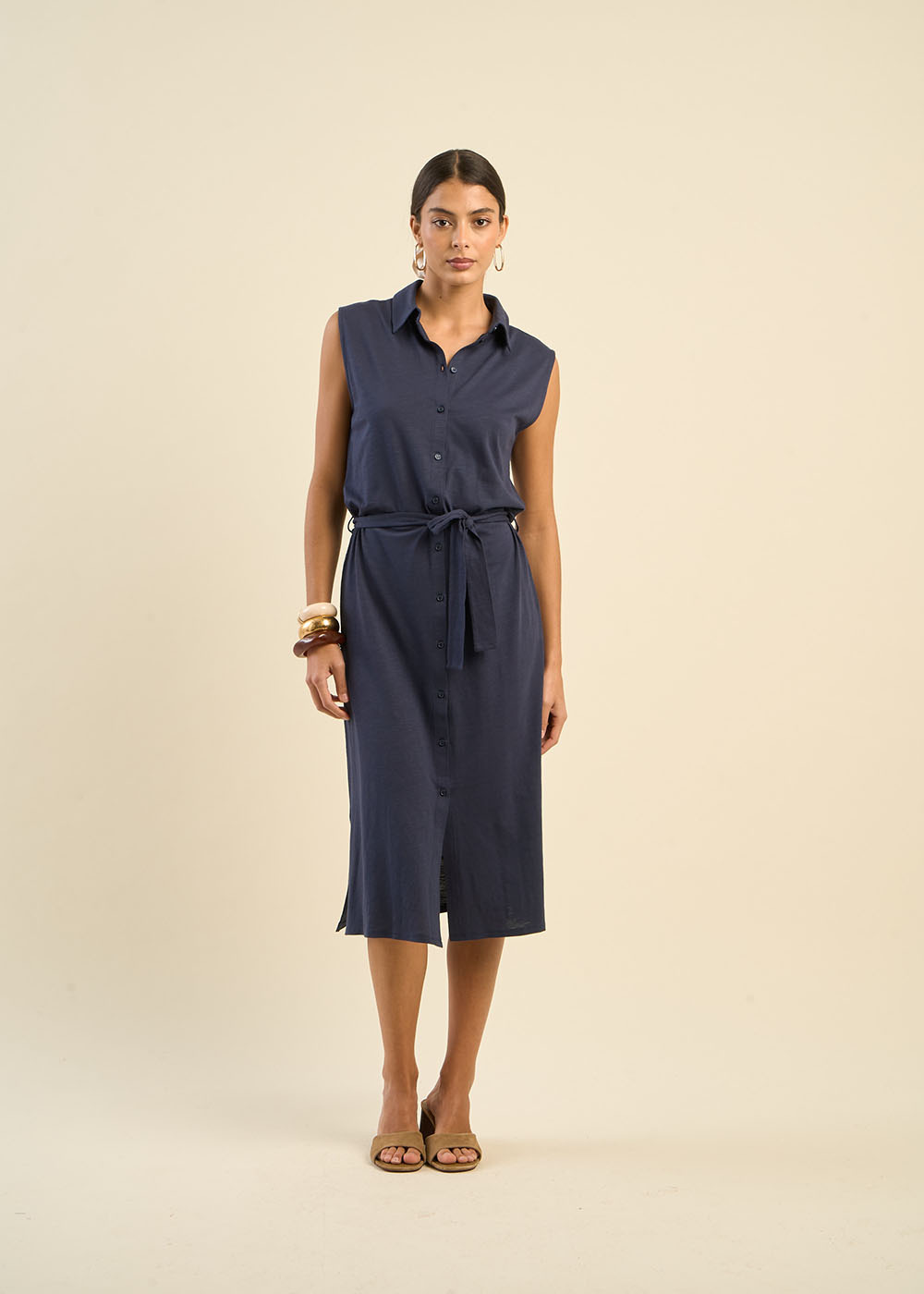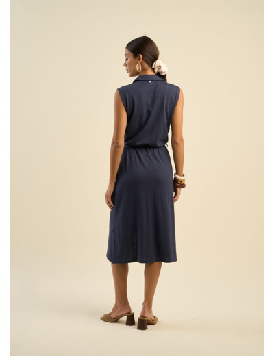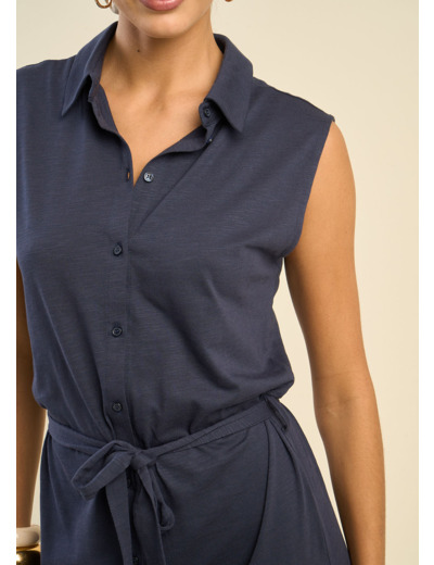 La robe RALIANY combine confort et élégance avec sa coupe sans manches aux épaules larges et tombantes, créant une silhouette fluide et moderne. Confectionnée en coton/modal, elle offre un toucher doux et agréable tout au long de la journée. Son col chemise avec boutonnage intégral ajoute une touche chic et raffinée, tandis que la ceinture à la taille souligne délicatement la silhouette. Les fentes sur les côtés apportent une note de légèreté et de mouvement à cette pièce intemporelle. Parfaite pour un look à la fois décontracté et sophistiqué.