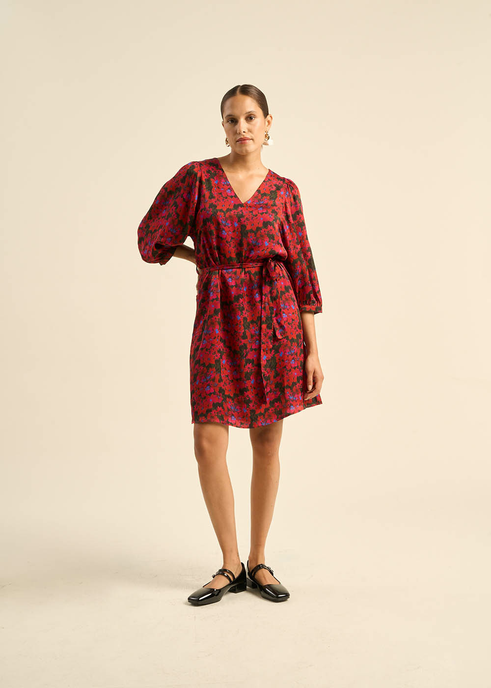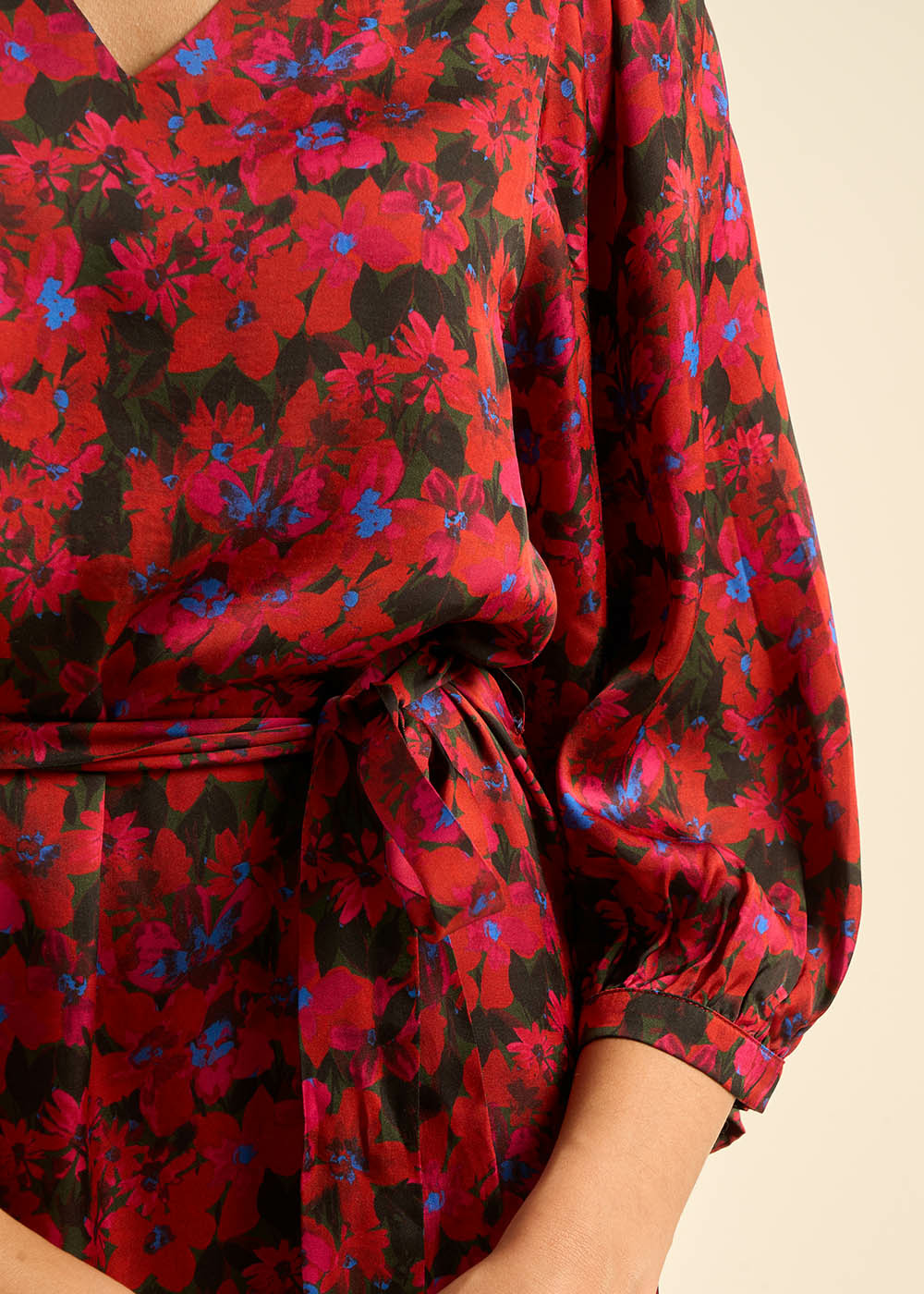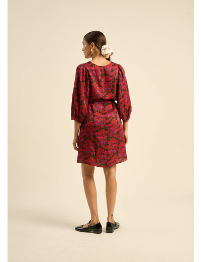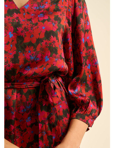 La robe courte RAMILIA en satin viscose se distingue par son imprimé floral vibrant en rouge, noir et une touche de bleu. Ses manches chauve-souris 3/4 et son encolure en V créent une silhouette fluide et élégante. À la taille, elle se ceinture avec une ceinture en tissu pour souligner votre forme. Parfaite pour ajouter une touche de glamour à vos journées comme à vos soirées.