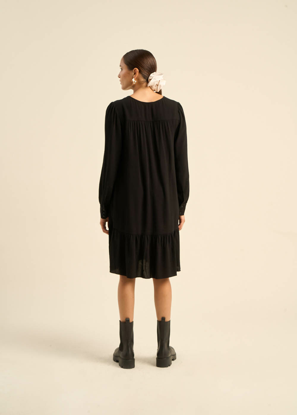 La robe courte ROLEANE, un mélange parfait d'élégance et de confort. Sa coupe ample et fluide en crêpe viscose vous offre une liberté de mouvement tout en sublimant votre silhouette. Le col tunisien avec finition lien apporte une touche féminine et romantique, tandis que les manches longues bouffantes et la découpe bas de robe froncée créent un volume flatteur. Un indispensable de votre garde-robe.