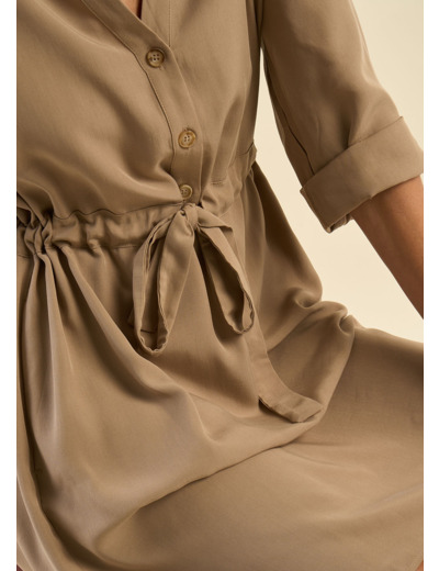 La robe Rabana est une robe courte élégante et polyvalente. Elle se distingue par ses manches 3/4 ajustables grâce à une patte, offrant la possibilité de moduler leur longueur selon vos envies. Son col chemise apporte une touche sophistiquée, tandis que la ceinture insérée à la taille, accompagnée d’un lien coulissant, permet de souligner la silhouette avec élégance. Enfin, ses poches italiennes ajoutent une fonctionnalité discrète et un détail chic à l'ensemble. Cette robe est idéale pour un look à la fois confortable et raffiné.