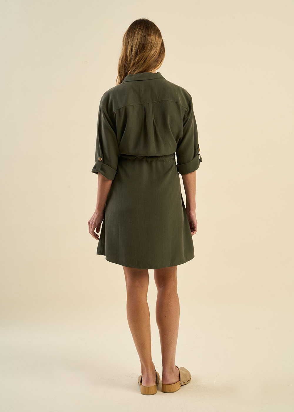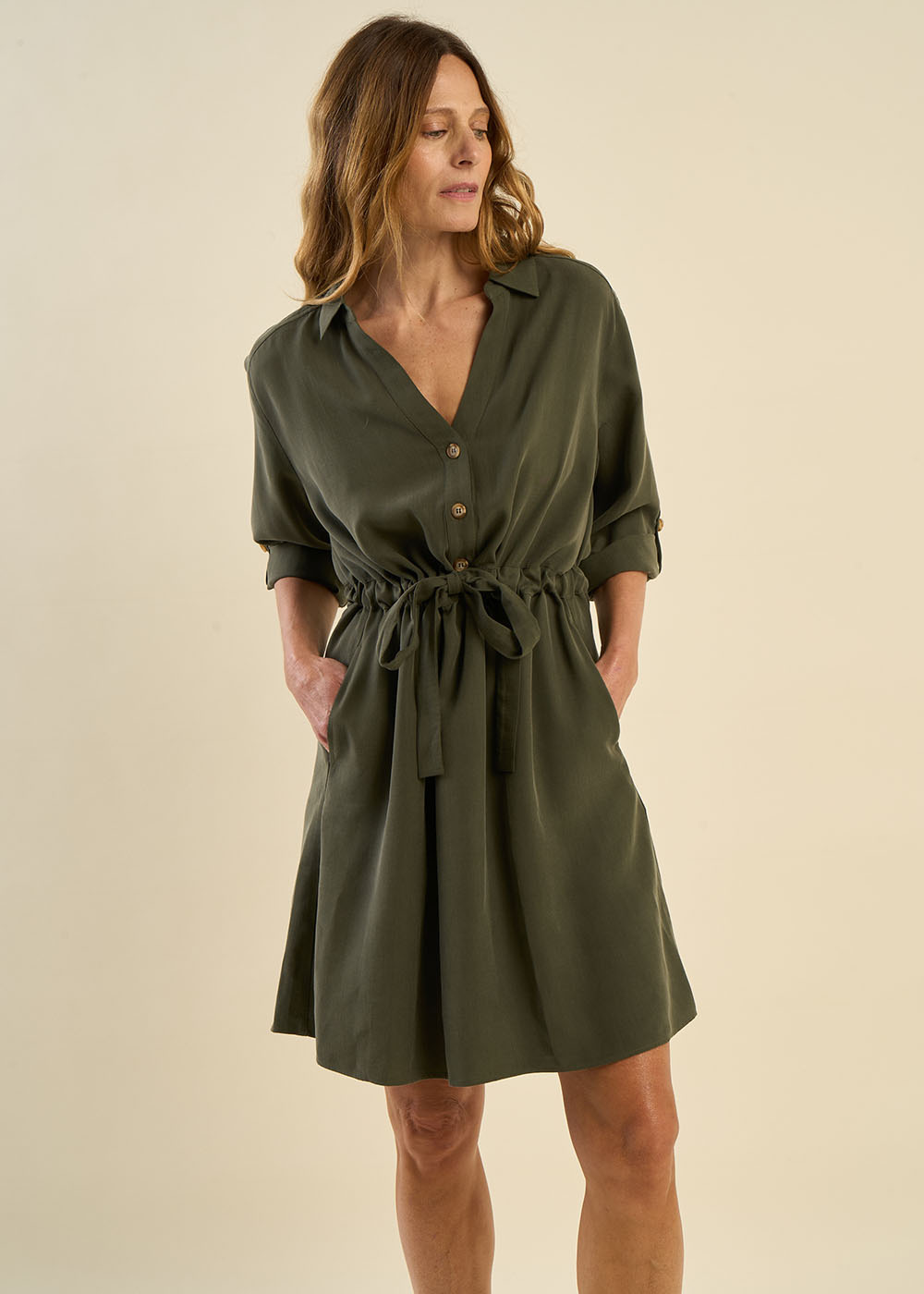 La robe Rabana est une robe courte élégante et polyvalente. Elle se distingue par ses manches 3/4 ajustables grâce à une patte, offrant la possibilité de moduler leur longueur selon vos envies. Son col chemise apporte une touche sophistiquée, tandis que la ceinture insérée à la taille, accompagnée d’un lien coulissant, permet de souligner la silhouette avec élégance. Enfin, ses poches italiennes ajoutent une fonctionnalité discrète et un détail chic à l'ensemble. Cette robe est idéale pour un look à la fois confortable et raffiné.