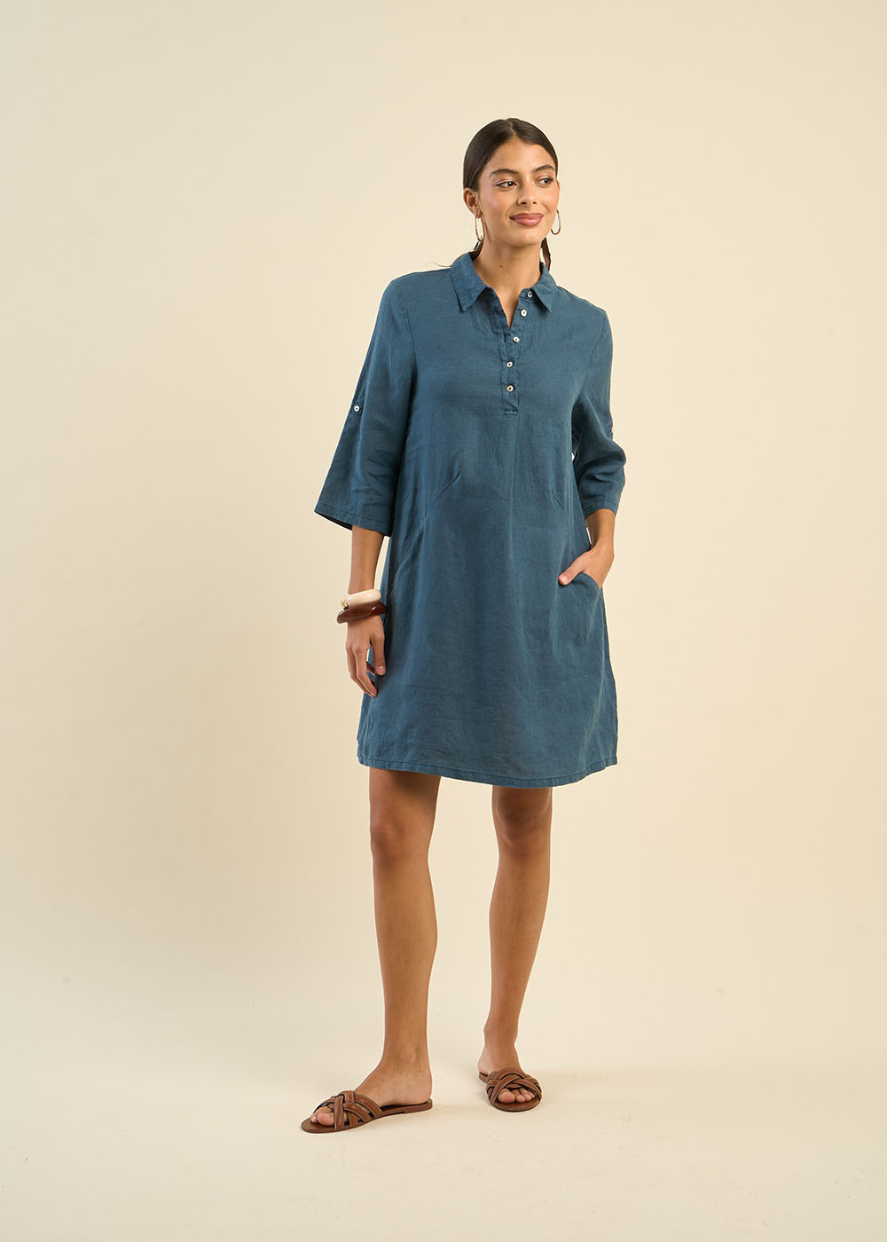 La robe courte RACYBA confectionnée entièrement en lin présente une silhouette tendance avec son col chemise classique et son pied de col. Sa patte de boutonnage à cinq boutons et ses manches longues avec patte pour faire un revers apportent une touche moderne et polyvalente à cette pièce féminine et estivale.