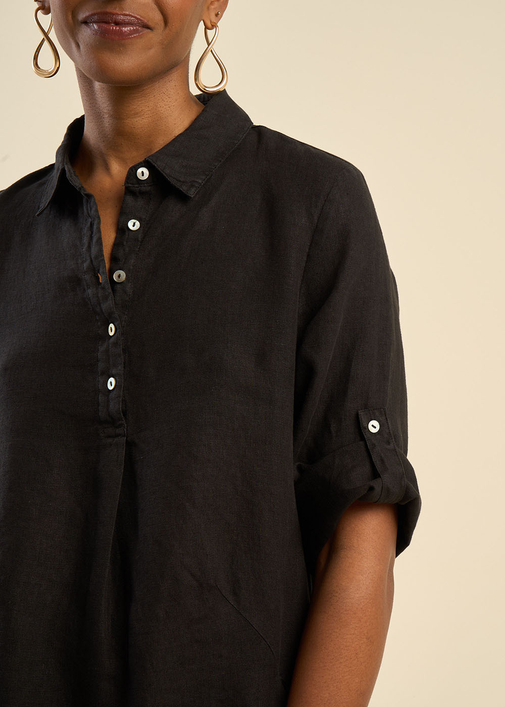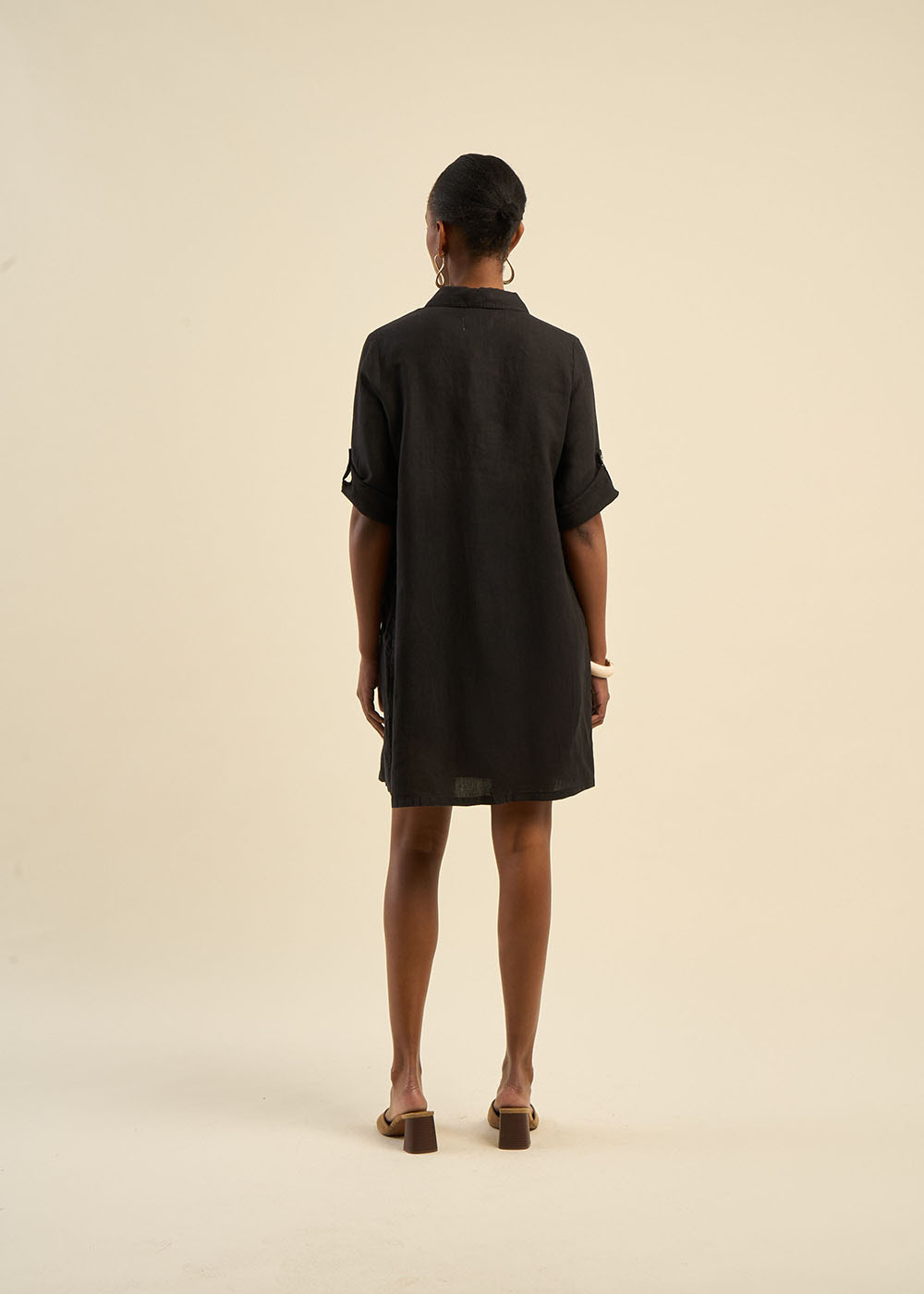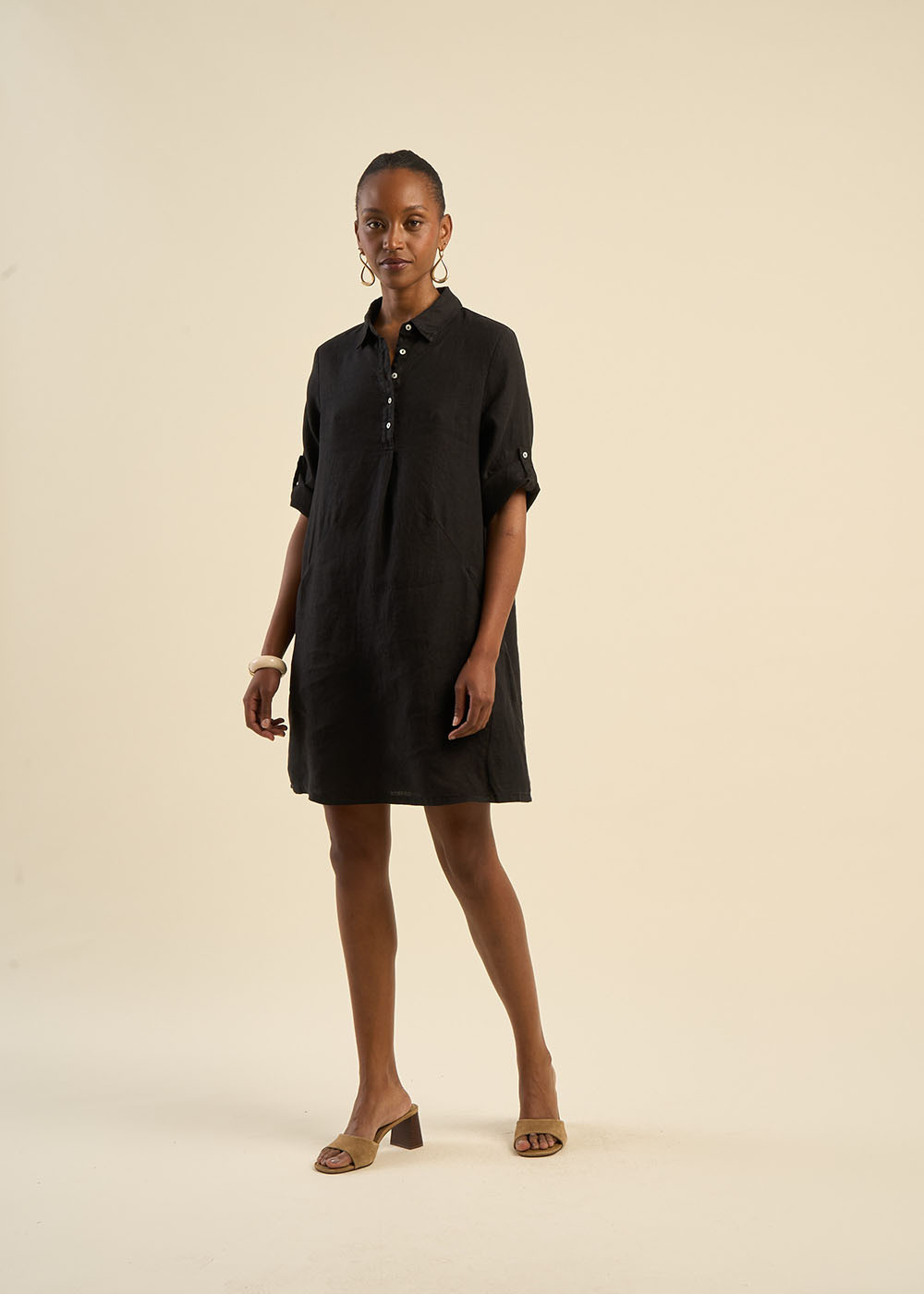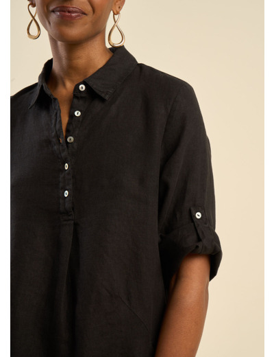 La robe courte RACYBA confectionnée entièrement en lin présente une silhouette tendance avec son col chemise classique et son pied de col. Sa patte de boutonnage à cinq boutons et ses manches longues avec patte pour faire un revers apportent une touche moderne et polyvalente à cette pièce féminine et estivale.