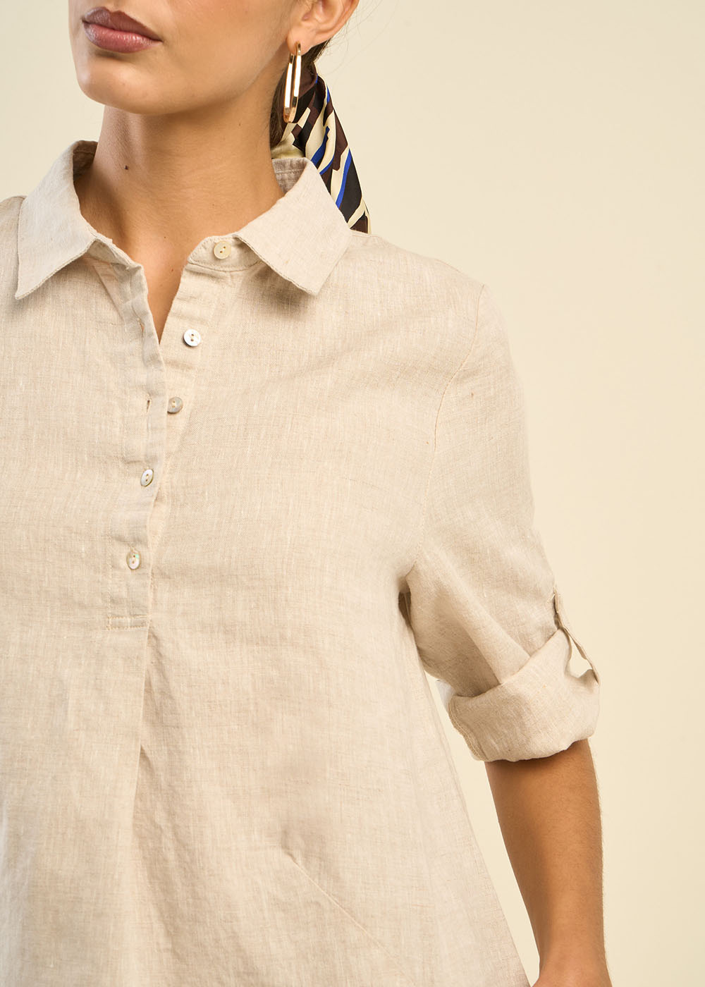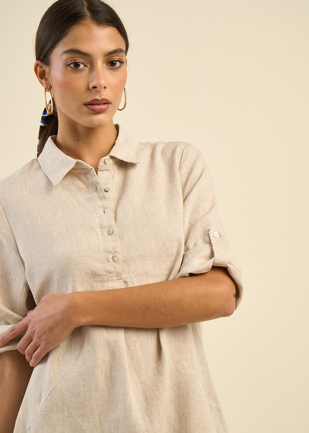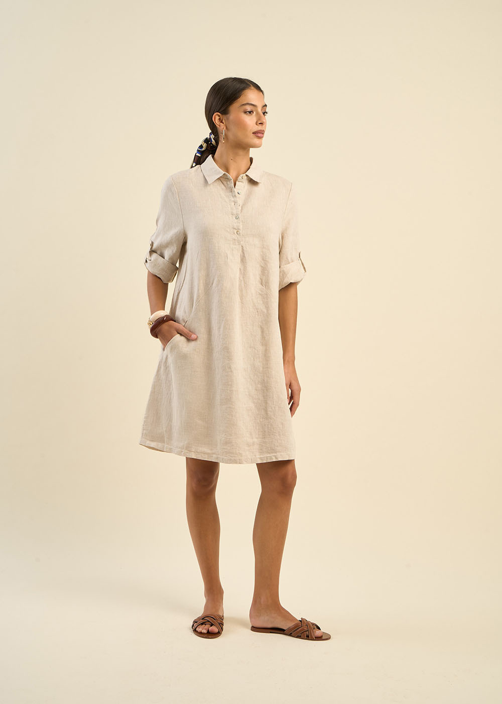 La robe courte RACYBA confectionnée entièrement en lin présente une silhouette tendance avec son col chemise classique et son pied de col. Sa patte de boutonnage à cinq boutons et ses manches longues avec patte pour faire un revers apportent une touche moderne et polyvalente à cette pièce féminine et estivale.