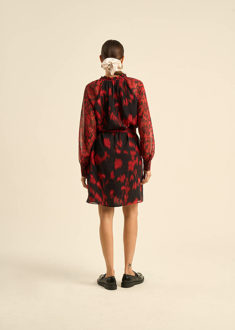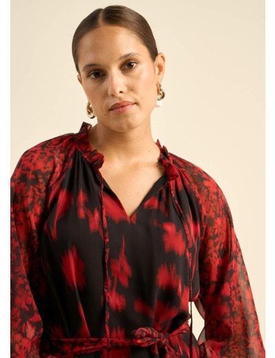 La robe RICAELA est une robe élégante et féminine avec un motif audacieux. Confectionnée dans une matière légère et fluide, elle se distingue par son design raffiné et ses détails soignés. Le col froncé en V ajoute une touche de sophistication, tandis que les manches longues bouffantes resserrées aux poignets apportent une note de romantisme. La ceinture à la taille permet de resserrer la robe, soulignant ainsi la silhouette avec élégance. Le motif floral rouge et noir apporte une note de charme et d'audace, parfaite pour des occasions spéciales ou des sorties chics.