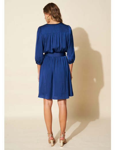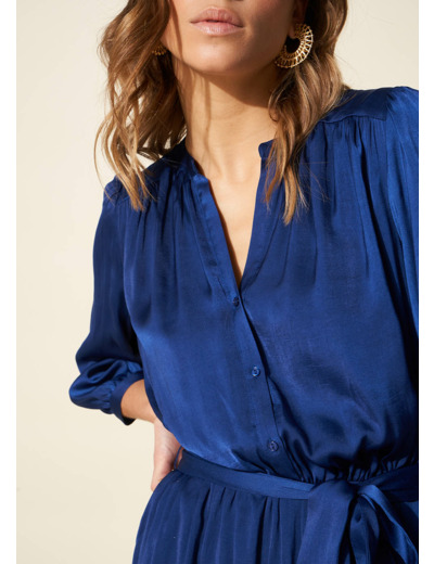 La robe courte RISLOU offre une élégance décontractée avec son col tunisien et sa patte de boutonnage. Les manches 3/4 présentent des fronces délicates en tête et en bas accentuées par un poignet classique à un bouton et une fente subtile. La taille élastiquée accompagnée d'une ceinture amovible offre un ajustement confortable et personnalisé. Les empiècements épaules et dos ornés de fronces ajoutent une touche de féminité. Une pièce polyvalente parfaite pour allier style et confort en toute simplicité.