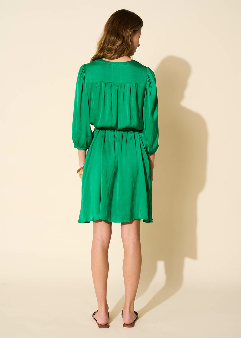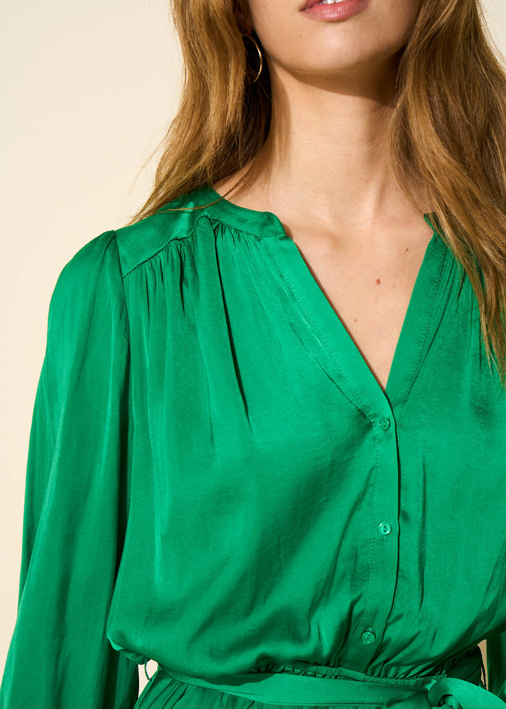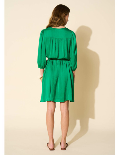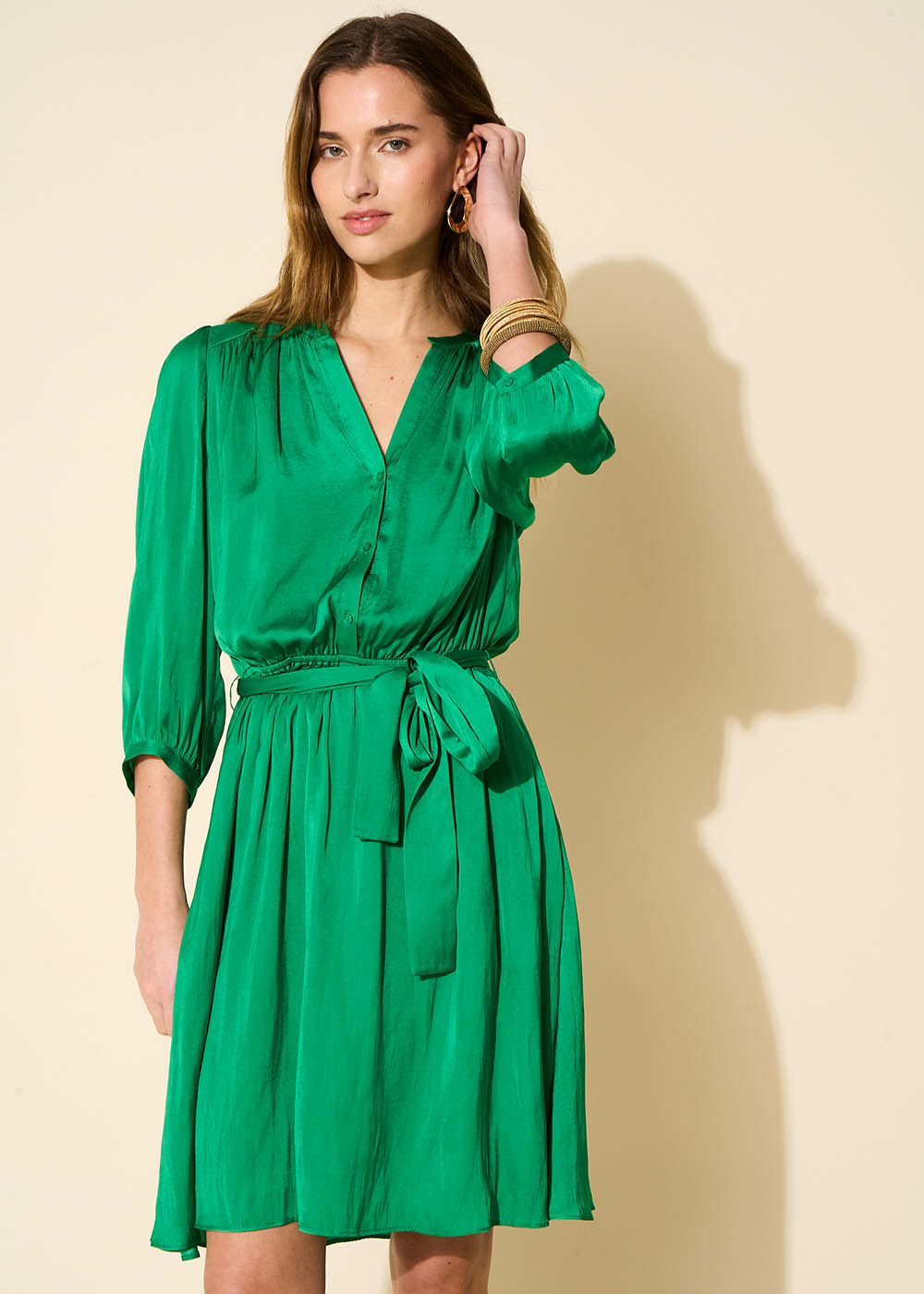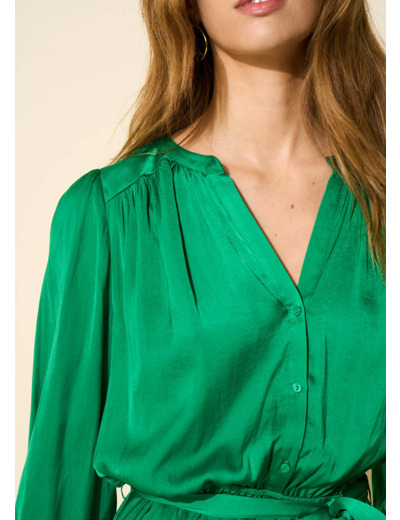 La robe courte RISLOU offre une élégance décontractée avec son col tunisien et sa patte de boutonnage. Les manches 3/4 présentent des fronces délicates en tête et en bas accentuées par un poignet classique à un bouton et une fente subtile. La taille élastiquée accompagnée d'une ceinture amovible offre un ajustement confortable et personnalisé. Les empiècements épaules et dos ornés de fronces ajoutent une touche de féminité. Une pièce polyvalente parfaite pour allier style et confort en toute simplicité.