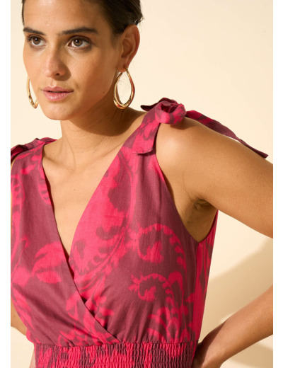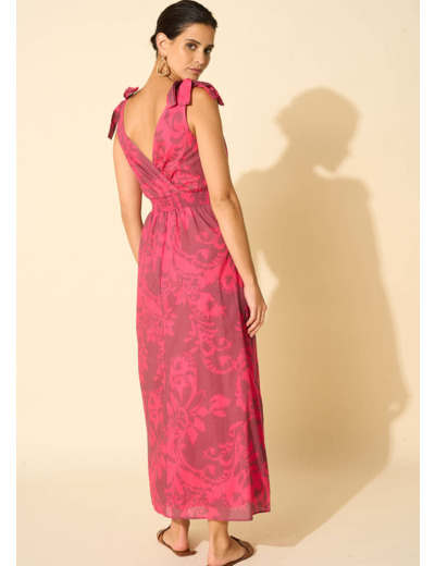 La robe RALBA se caractérise par ses élégants noeuds délicatement noués aux bretelles. Elle est dotée d'un col en V et d'une couture à la taille pour une silhouette flatteuse. Son jupon est agrémenté d'un volant féminin. Pour parfaire votre tenue associez-la à un panier en osier.