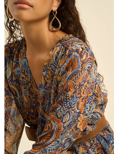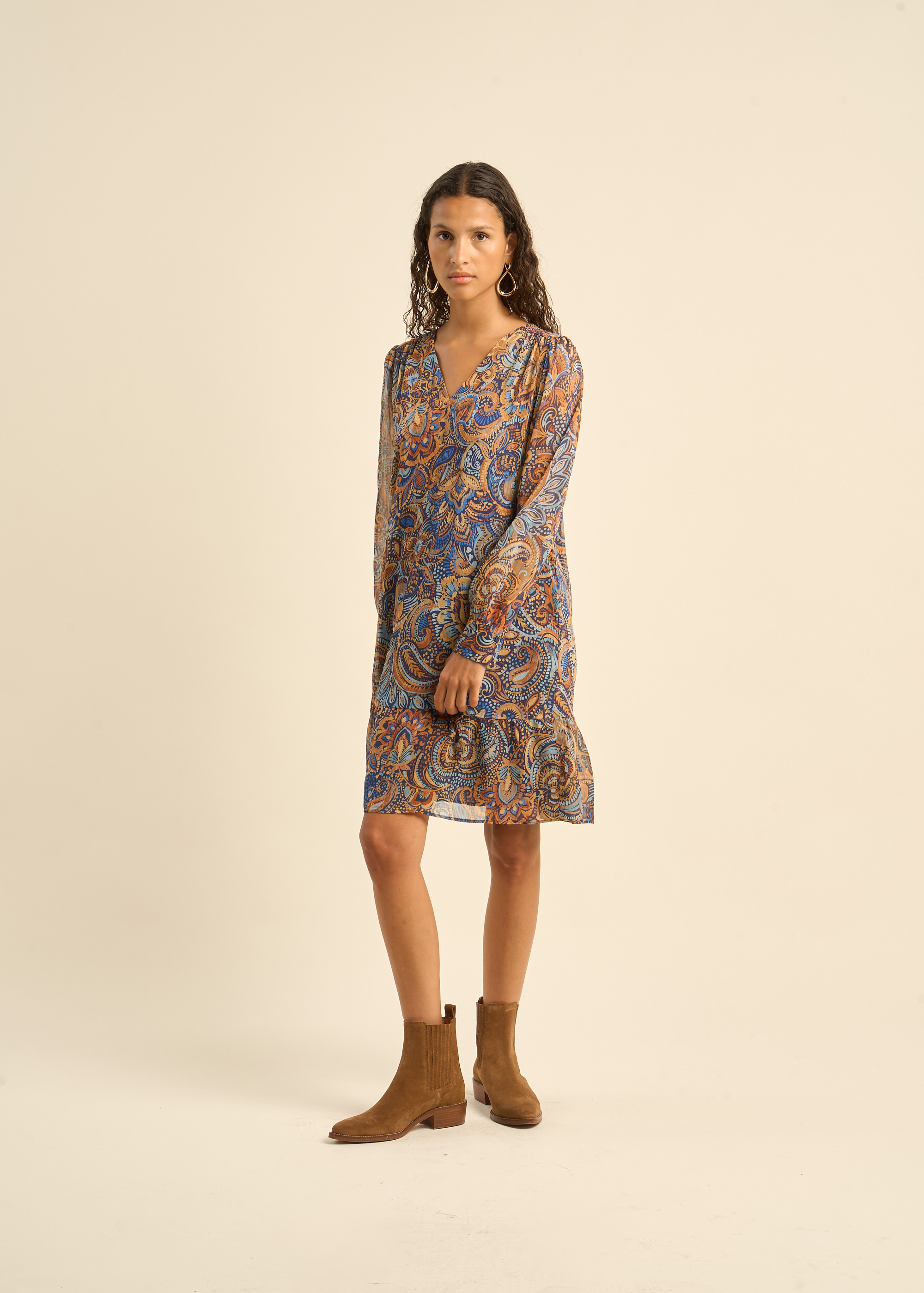 Laissez-vous envoûter par RADJILIE, notre robe courte imprimé cachemire bleu et camel. Son encolure en V sublime le décolleté, tandis que ses manches longues à poignets larges apportent une touche de sophistication. La découpe froncée à la base de la robe ajoute du volume et du mouvement, créant une silhouette à la fois féminine et élégante. Une pièce idéale pour rayonner en toute occasion.