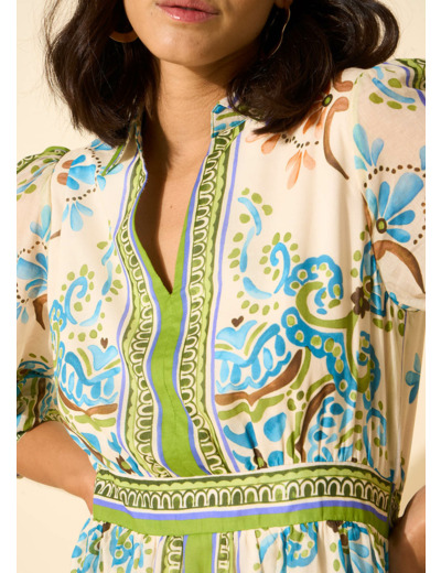 La robe RAVAYA se démarque par son élégant imprimé cachemire agrémenté de détails verts. Elle présente un col en V et des manches 3/4. Avec son style sophistiqué elle se suffit à elle-même. Pour compléter votre look portez-la avec une paire de ballerines.