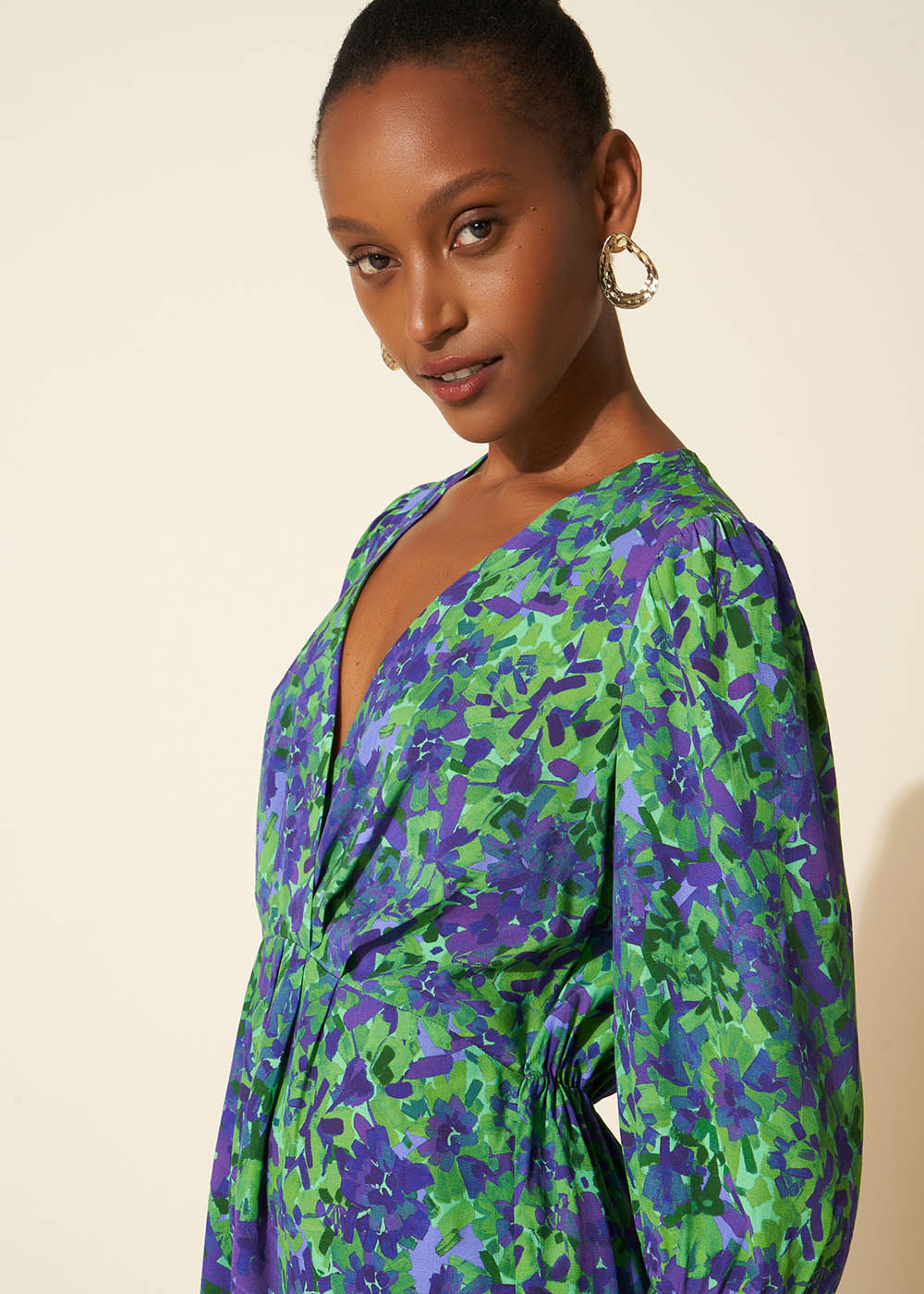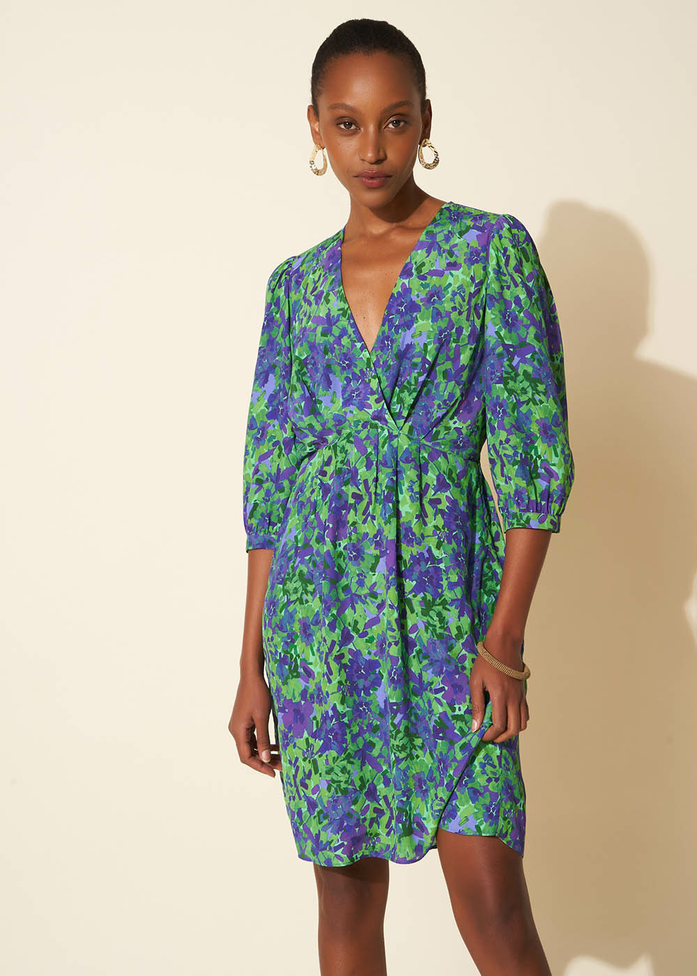 La robe courte RADOVIE présente des imprimés vibrants ainsi que des manches 3/4 et une fente délicate. Son col en V lui apporte une élégance supplémentaire tandis que ses pinces sur le devant lui assurent une coupe flatteuse. Associez-la à une jolie paire de sandales ouvertes pour un look féminin chic et estival.