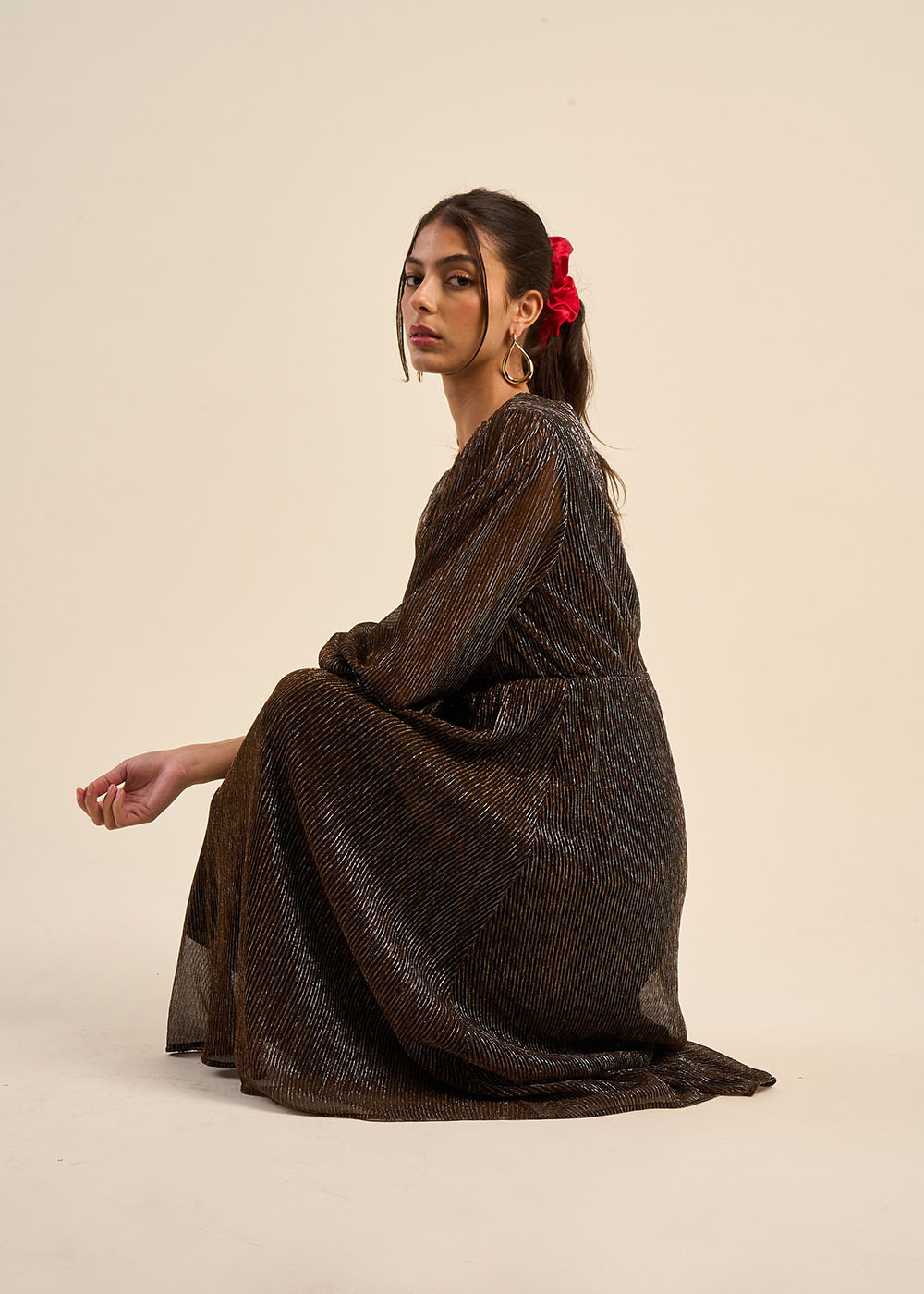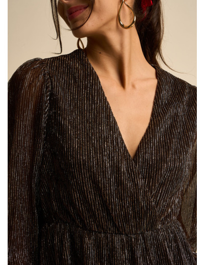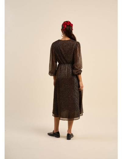 ROKIBA, la robe midi qui vous fera briller de mille feux. Son lamé doré plissé, ultra-féminin, et sa coupe asymétrique créent un effet visuel saisissant. Les manches longues volumineuses ajoutent du mouvement, tandis que la taille élastique assure un confort optimal. Parfaite pour une soirée spéciale, cette robe vous fera rayonner.
