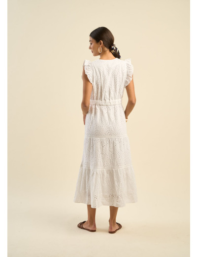 La robe longue RIVAKA séduit par son charme bohème et son élégance intemporelle. Confectionnée en broderie anglaise 100 % coton, elle offre un confort naturel et une belle légèreté. Son col V met en valeur le décolleté, tandis que ses emmanchures montées et évasées apportent une touche fluide et féminine. Structurée par une coupe à étages, elle crée un mouvement gracieux et raffiné, idéal pour une allure à la fois romantique et sophistiquée.