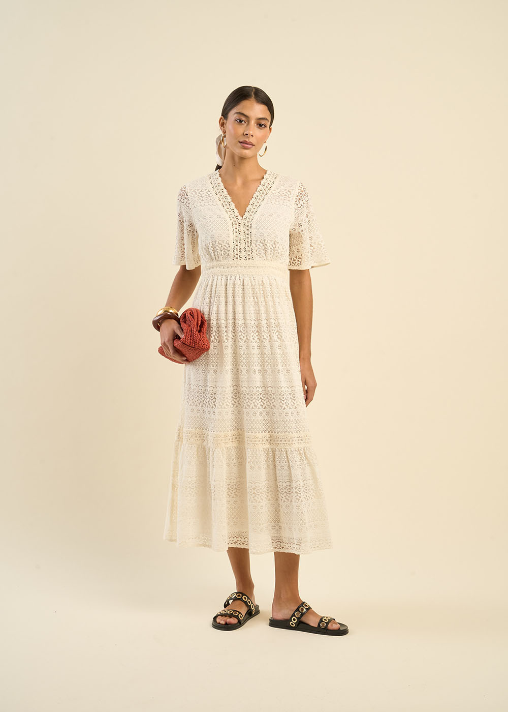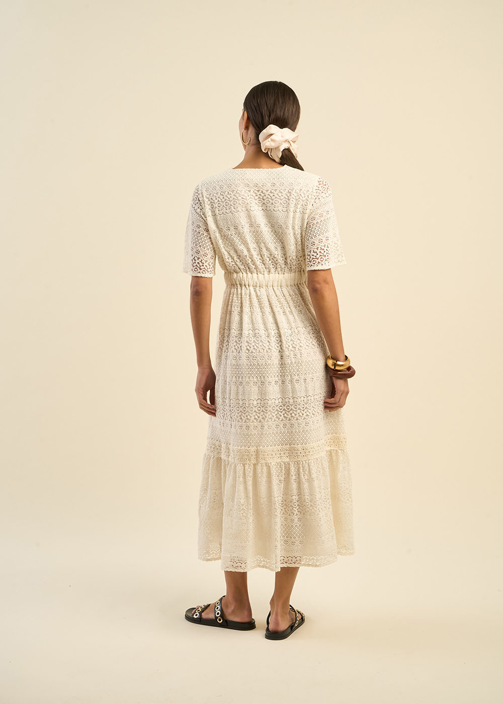 La robe RASOPHIA incarne parfaitement l’élégance bohème avec sa dentelle délicate et sa coupe fluide. Son col V flatteur et ses manches courtes papillon apportent une touche de légèreté et de romantisme. Sa silhouette évasée sublime chaque mouvement, offrant à la fois confort et féminité. Doublée en voile de coton, elle assure une sensation douce et agréable sur la peau. Idéale pour une allure à la fois chic et naturelle, elle se porte aussi bien avec des sandales que des bottines pour un style bohème affirmé.