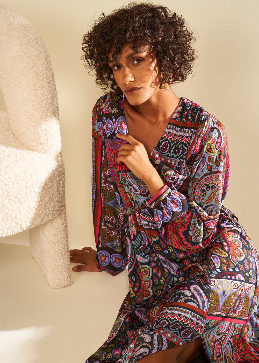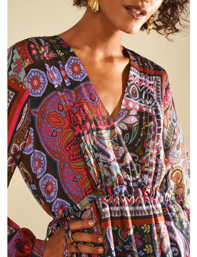 Craquez pour la RALAGE! Cette robe longue imprimée à l'encolure en V ajoutera une touche d'élégance à votre garde-robe. Les plis plats à l'avant offre une silhouette flatteuse tandis que la coulisée à la taille avec des liens permet d'ajuster parfaitement la robe à votre silhouette. Enfin la fente à l'avant ajoute une touche de sensualité et de fluidité à chaque pas que vous ferez.