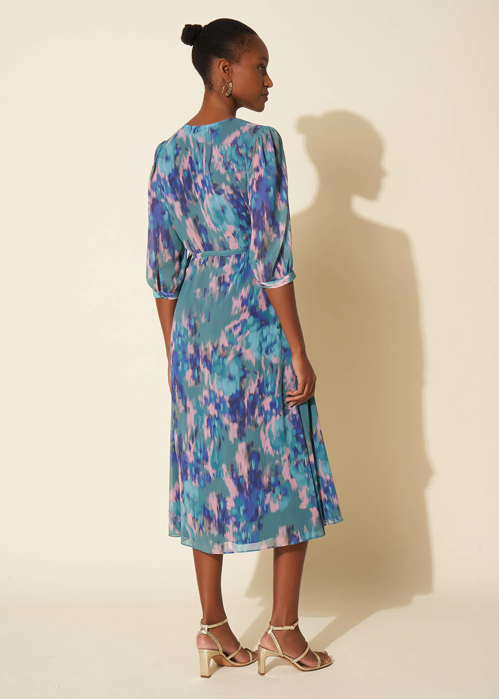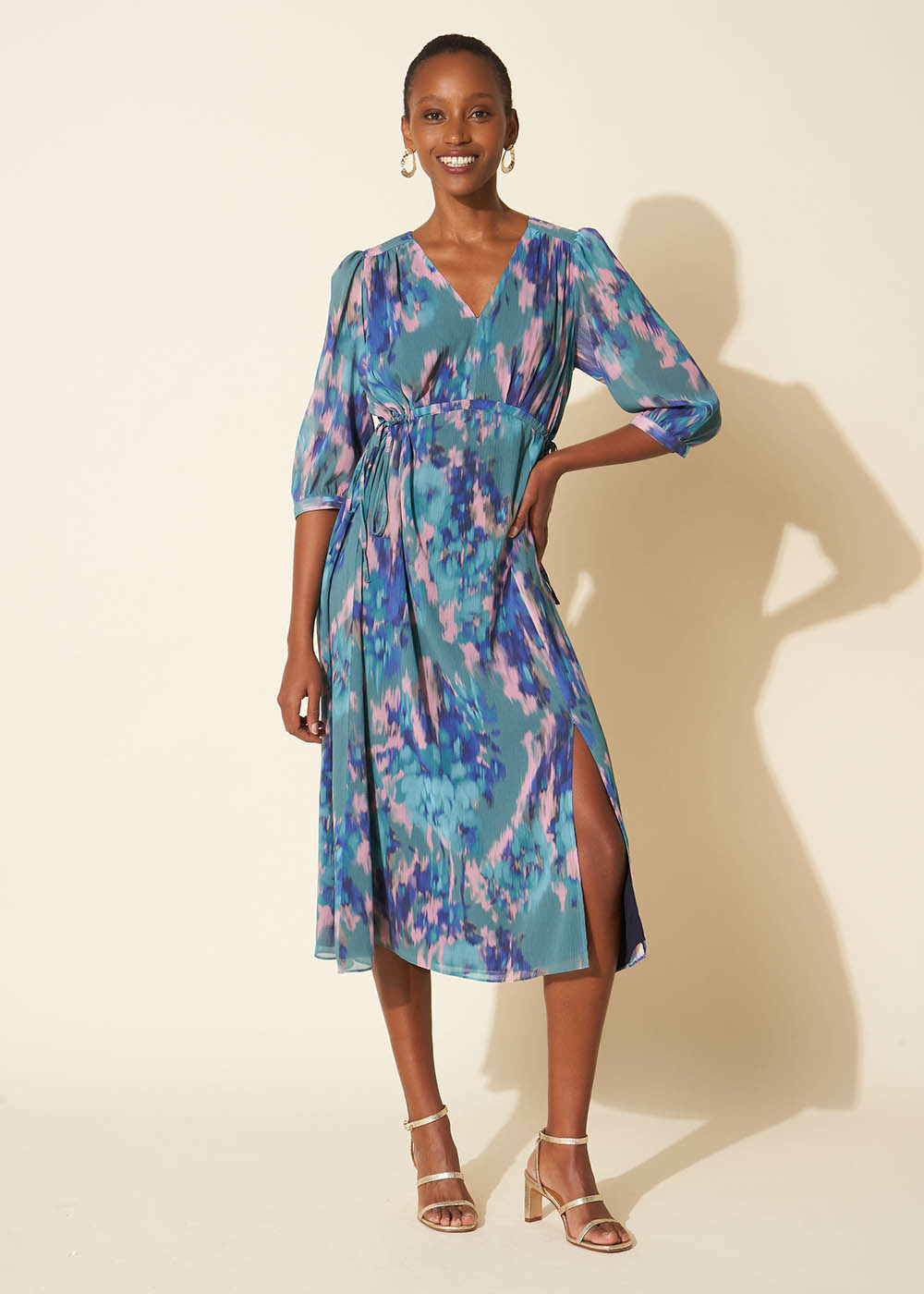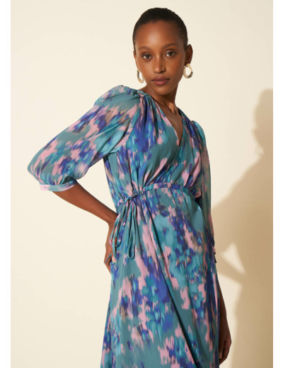 La robe longue RASKA présente un imprimé unique des manches courtes et un col en V. Des liens ajustables à la taille offrent la possibilité de cintrer la robe selon vos préférences. De plus elle est dotée d'une fente à l'avant ajoutant une touche de style supplémentaire. Complétez votre tenue en associant la robe avec des sandales dorées élégantes.