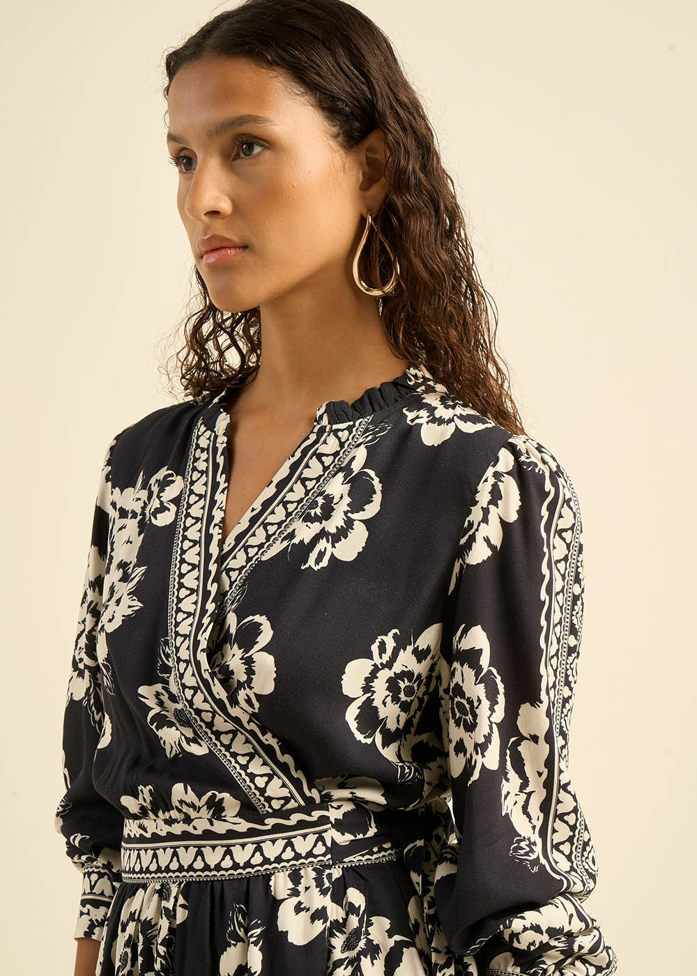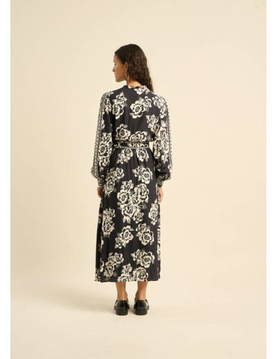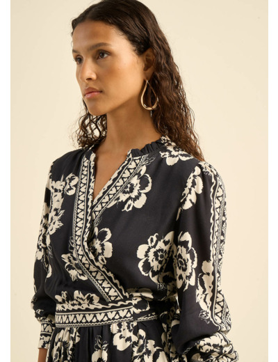 La robe midi RACALIE en fibranne de viscose imprimée noir et blanc incarne un charme irrésistible. Avec ses manches longues bouffantes terminées par des poignets et son encolure ornée de volants, elle apporte une touche romantique à votre tenue. Son décolleté cache-cœur met en valeur la silhouette, tandis que la taille est cintrée par une ceinture en tissu à nouer sur le devant, ajoutant une touche d'élégance. Polyvalente et sophistiquée, la robe RACALIE est l'incarnation parfaite de l'élégance intemporelle, idéale pour toutes les occasions.