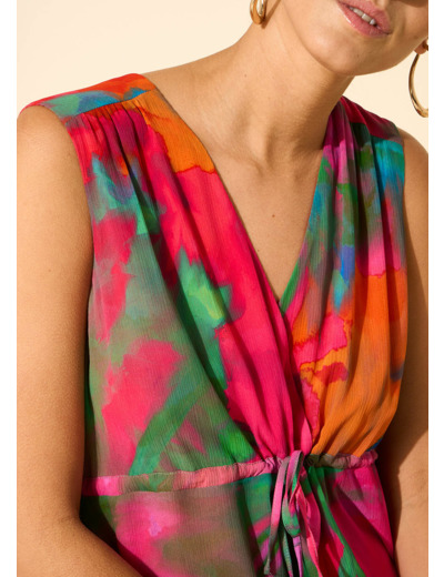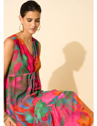 La robe longue RABYLA se démarque par son imprimé solaire éclatant. Elle présente un col en V, des manches absentes et un lien à la poitrine pour ajuster le buste. Son jupon est doté d'une couture discrète. Pour compléter votre tenue, associez-la à une paire de sandales dorées.