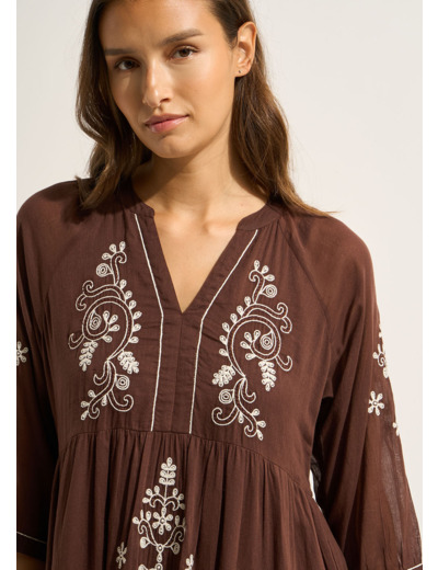 La robe ROBANA conjugue allure bohème et légèreté estivale. Confectionnée en gaze de coton, elle séduit par ses broderies contrastées et son volume aérien.