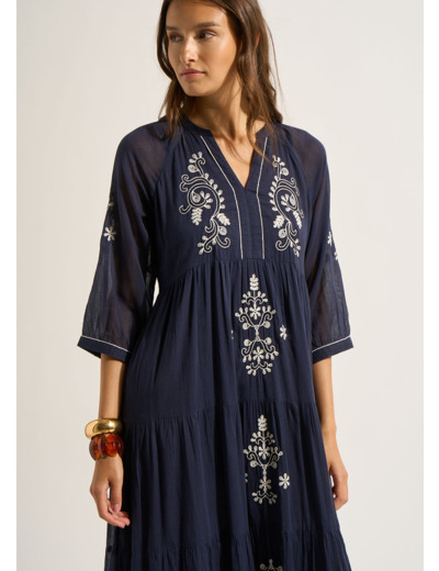 La robe ROBANA conjugue allure bohème et légèreté estivale. Confectionnée en gaze de coton, elle séduit par ses broderies contrastées et son volume aérien.