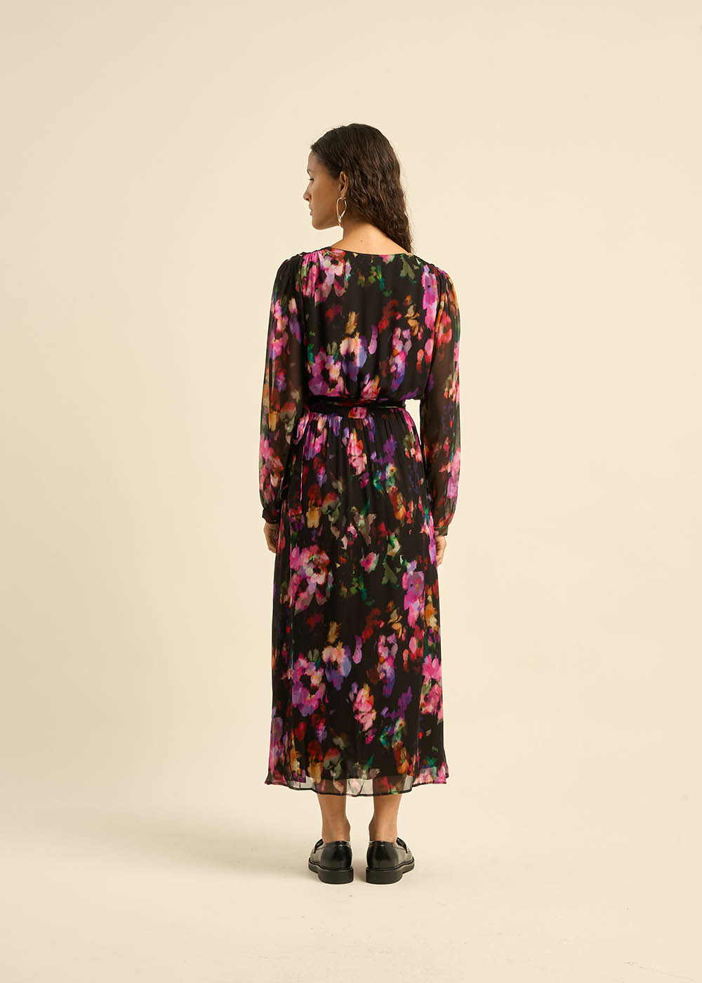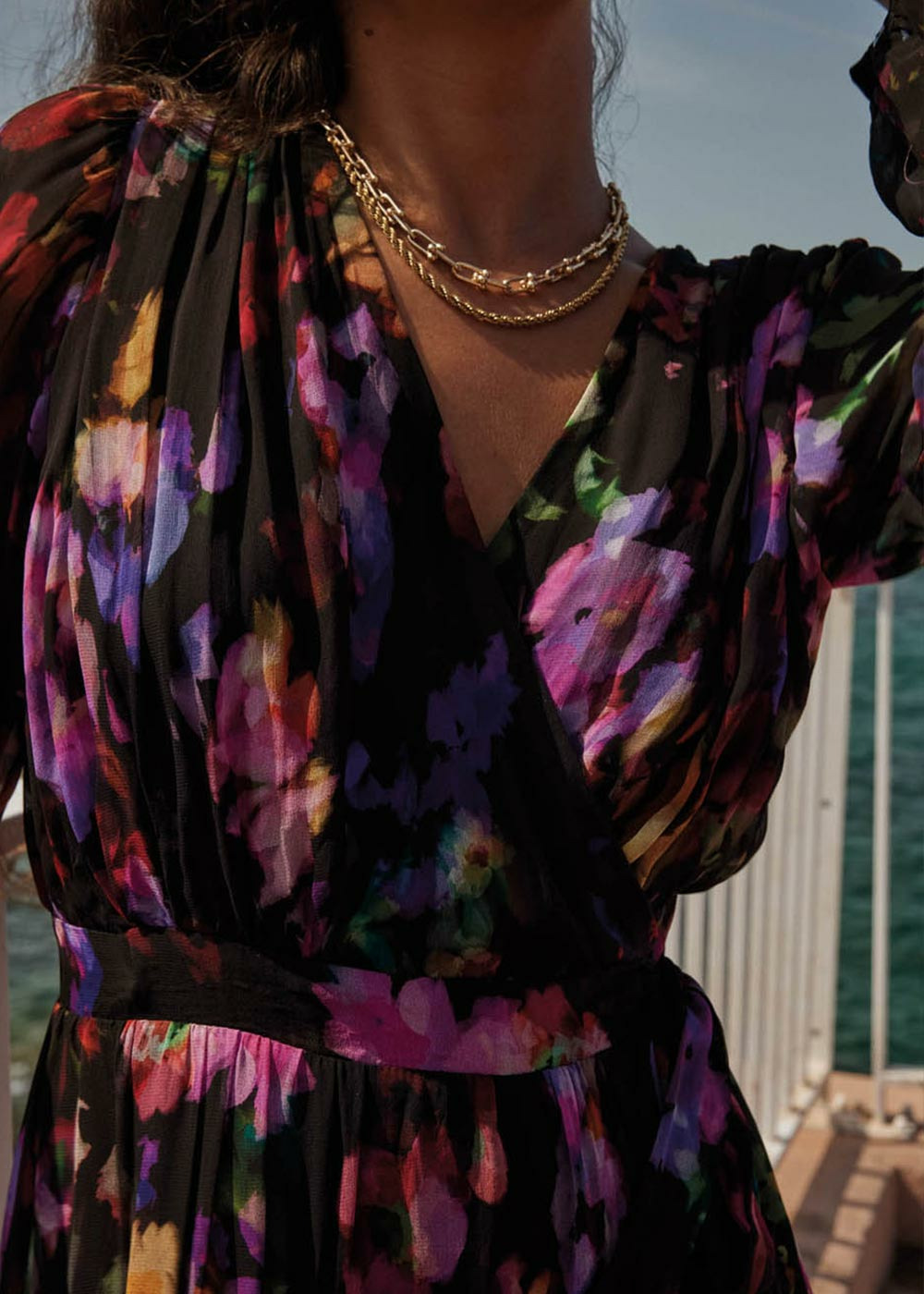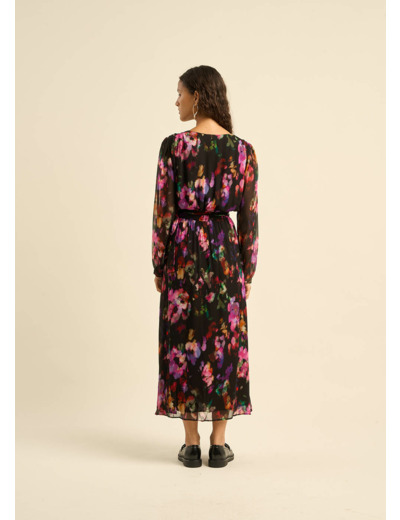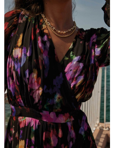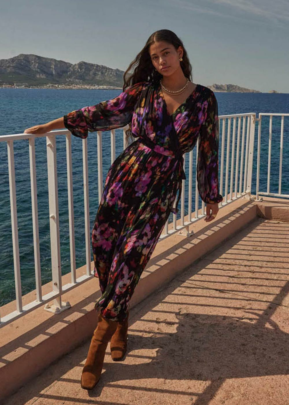 RACLAUDIE, la robe longue qui ose. Son imprimé floral tacheté, aux couleurs vibrantes, contraste avec la fluidité du voile de viscose. L'encolure cache-cœur et la ceinture soulignent la taille, tandis que les manches volumineuses apportent une touche rock.