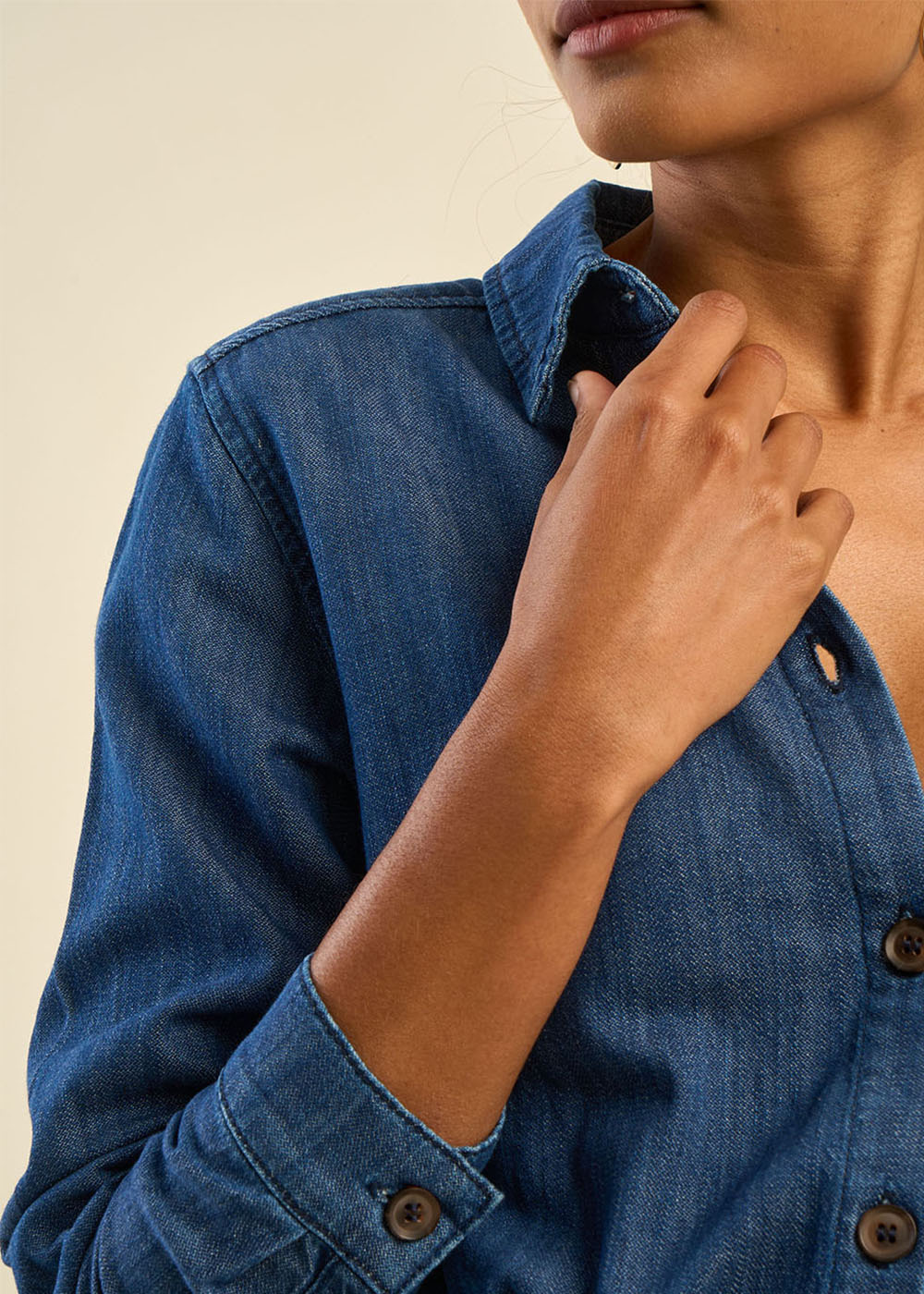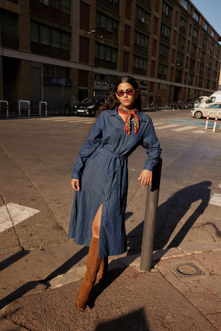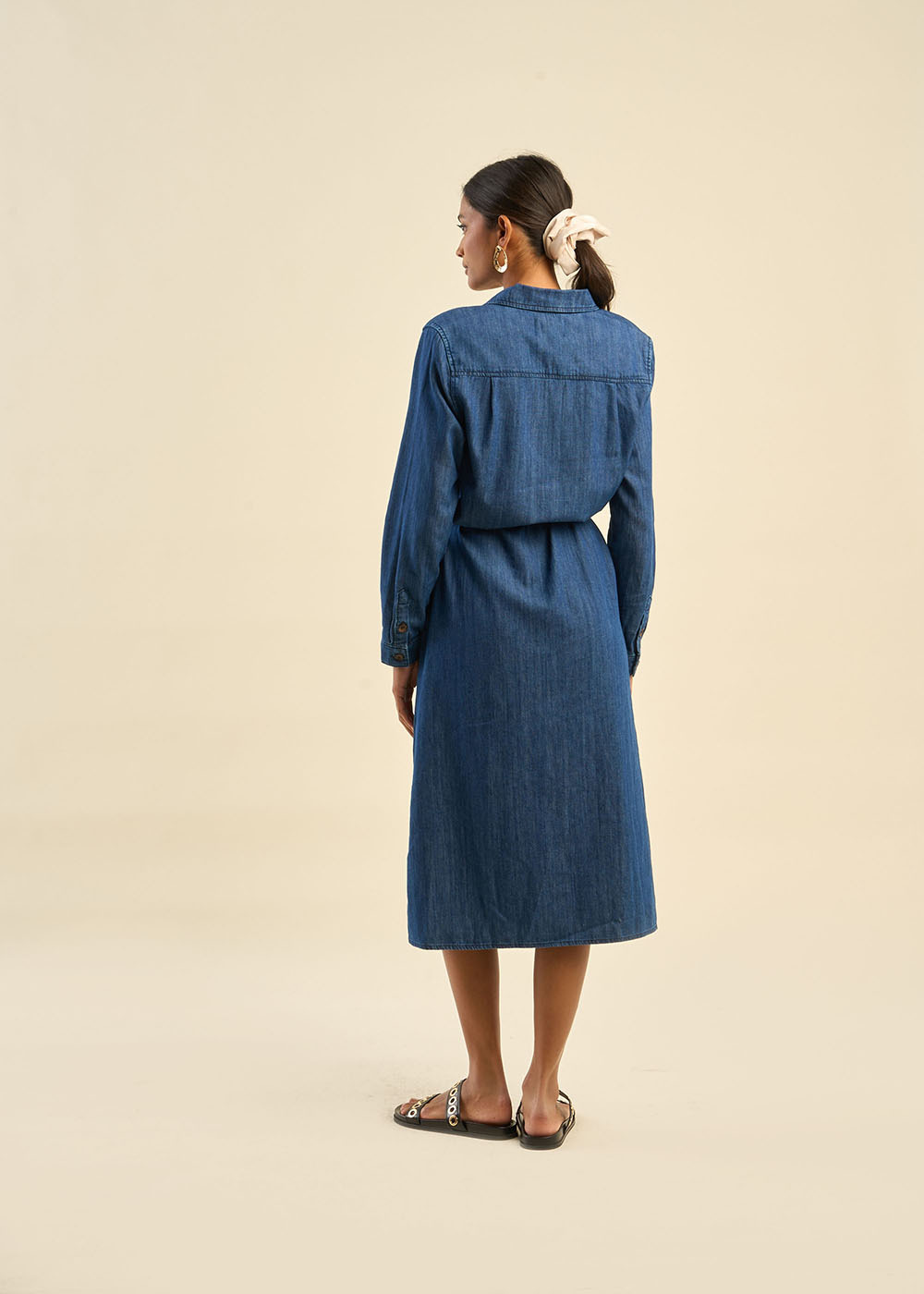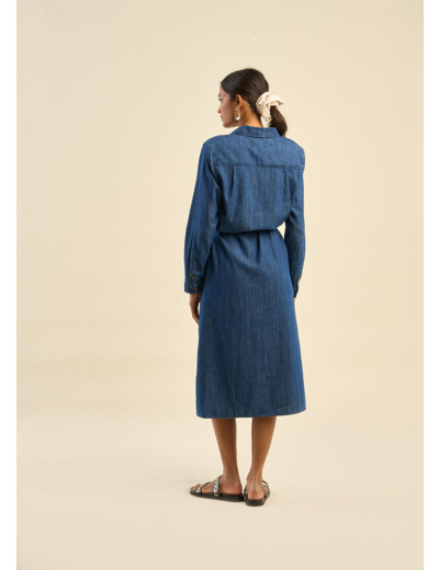 La robe mi-longue en jean RAZKALA se distingue par son col chemise classique et sa taille marquée, mettant en valeur la silhouette. Elle est également dotée de pinces poitrine pour une coupe structurée, ainsi que de poches plaquées à l'avant qui ajoutent une touche pratique et tendance.