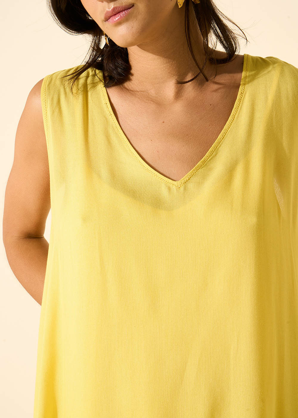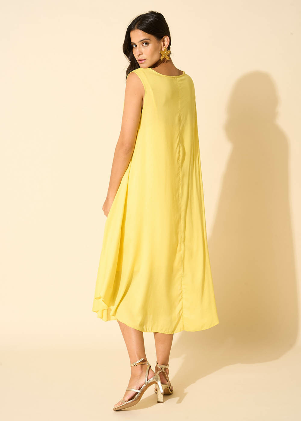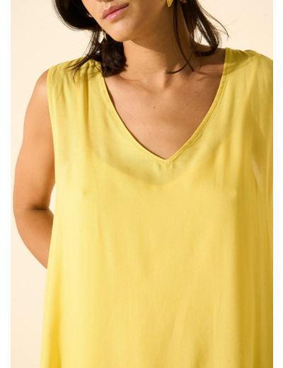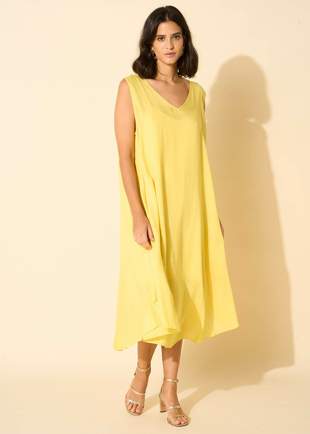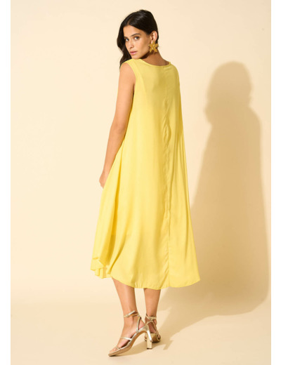 La robe RIMITI se caractérise par sa coupe midi, légèrement plus courte sur les côtés. Elle arbore un col en V et est dépourvue de manches, avec un fond de robe à bretelles intégré. Complétez votre tenue en l'associant à une paire de sandales dorées.