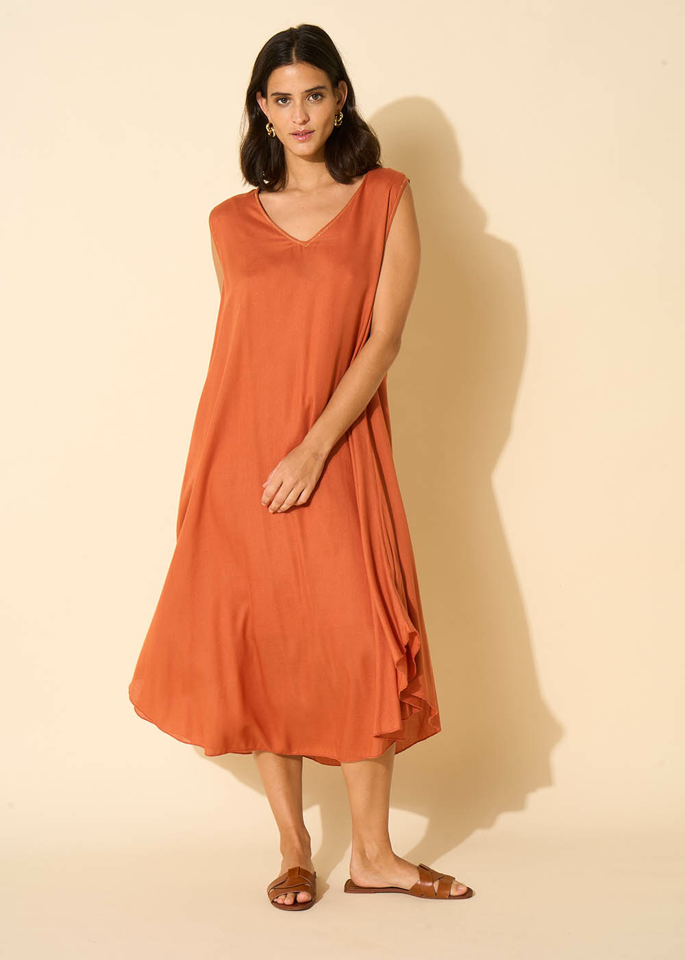 La robe RIMITI se caractérise par sa coupe midi, légèrement plus courte sur les côtés. Elle arbore un col en V et est dépourvue de manches, avec un fond de robe à bretelles intégré. Complétez votre tenue en l'associant à une paire de sandales dorées.