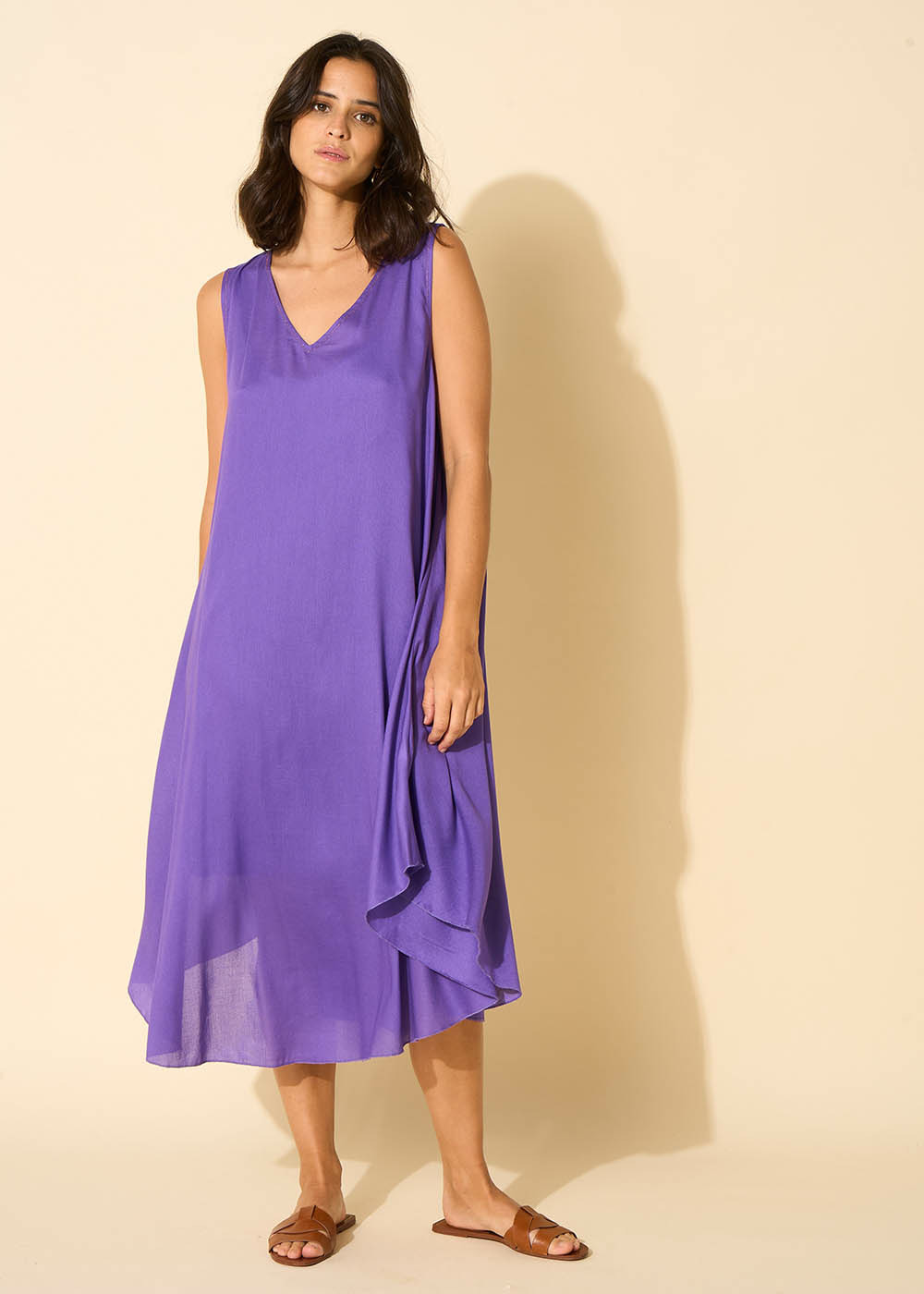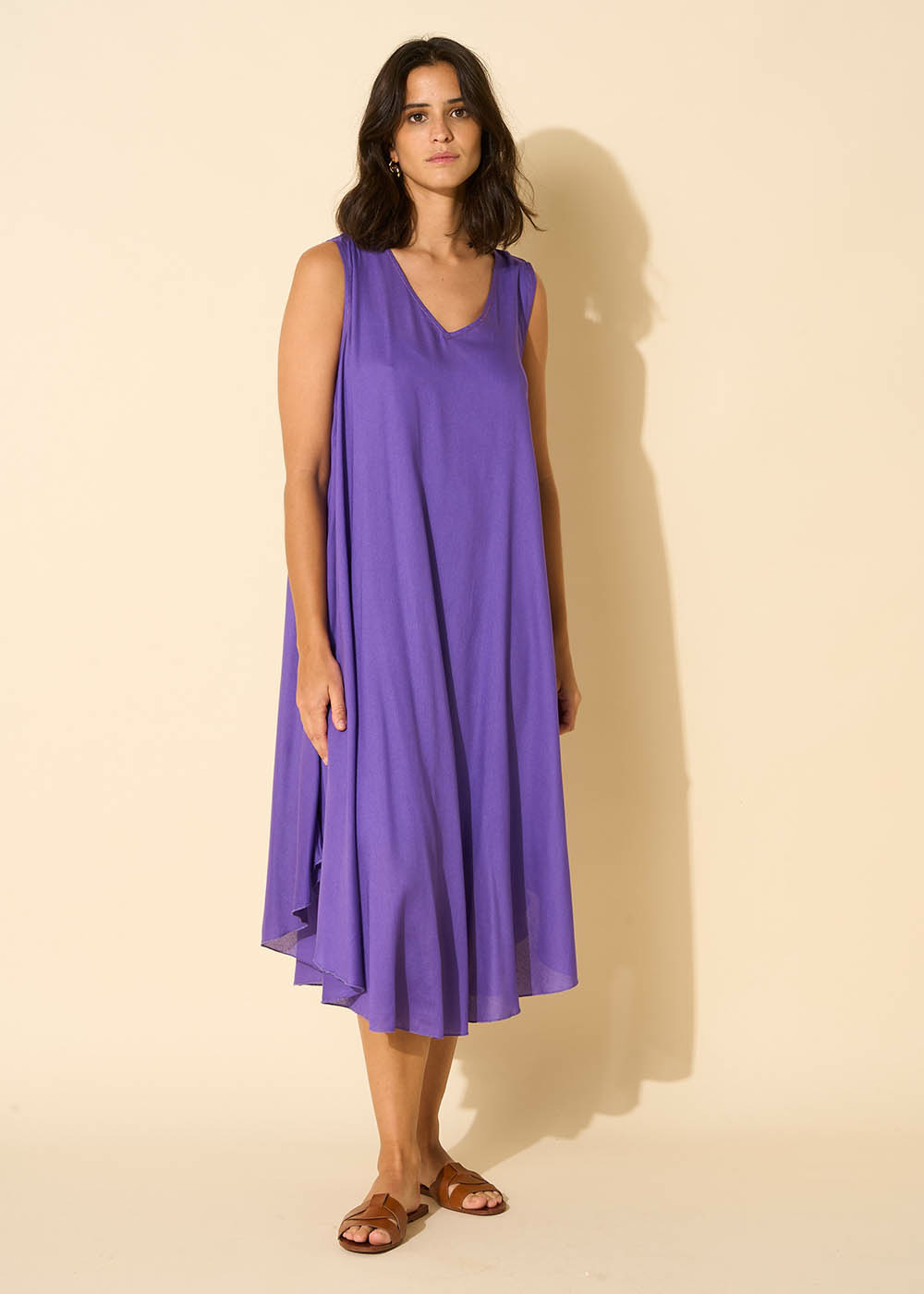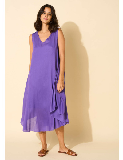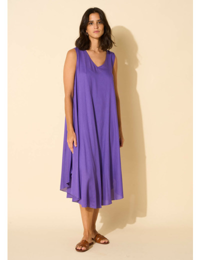 La robe RIMITI se caractérise par sa coupe midi, légèrement plus courte sur les côtés. Elle arbore un col en V et est dépourvue de manches, avec un fond de robe à bretelles intégré. Complétez votre tenue en l'associant à une paire de sandales dorées.