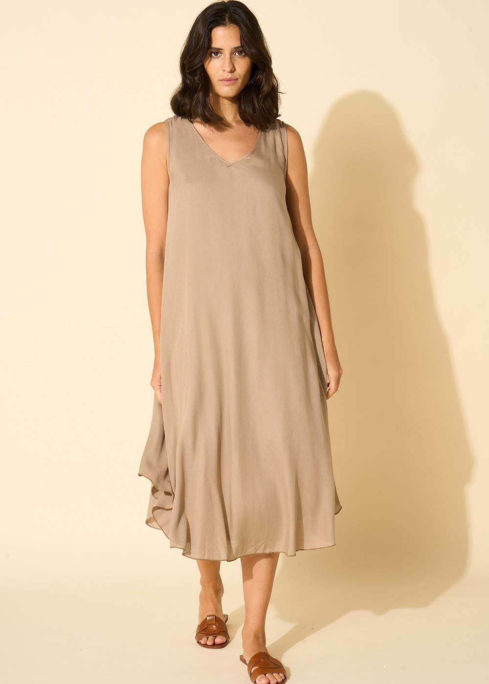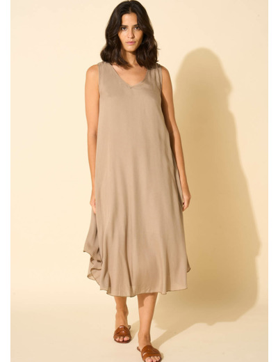 La robe RIMITI se caractérise par sa coupe midi, légèrement plus courte sur les côtés. Elle arbore un col en V et est dépourvue de manches, avec un fond de robe à bretelles intégré. Complétez votre tenue en l'associant à une paire de sandales dorées.