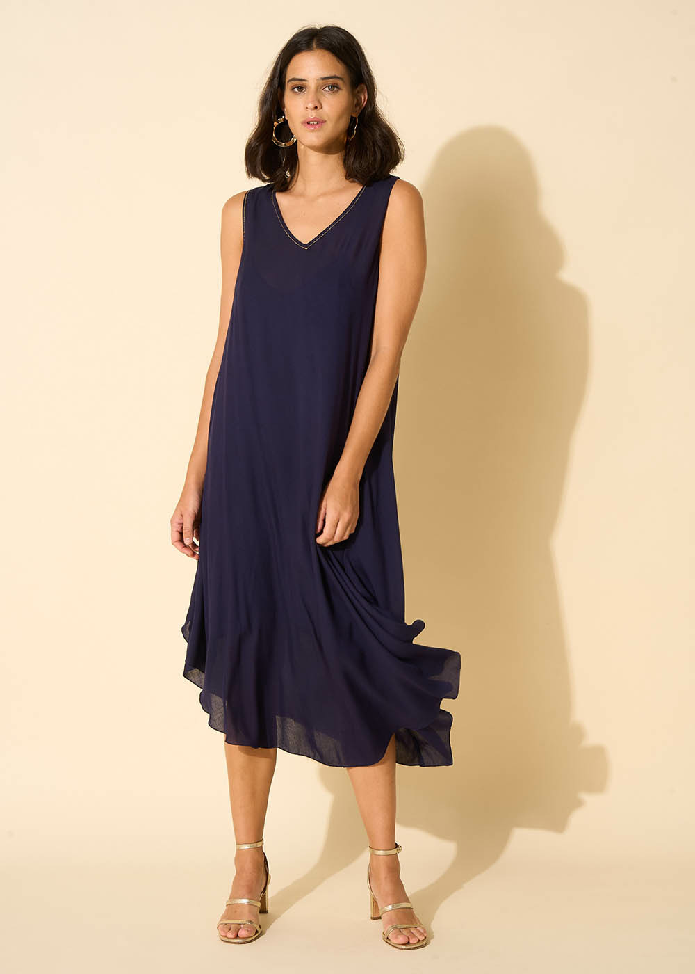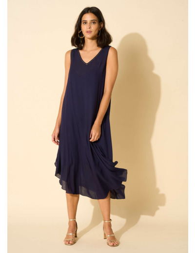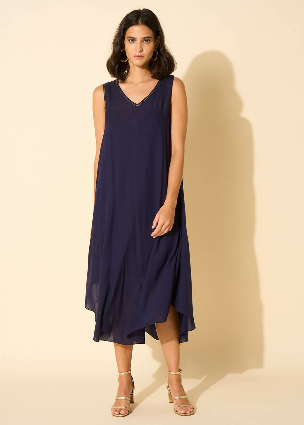 La robe RIMITI se caractérise par sa coupe midi, légèrement plus courte sur les côtés. Elle arbore un col en V et est dépourvue de manches, avec un fond de robe à bretelles intégré. Complétez votre tenue en l'associant à une paire de sandales dorées.