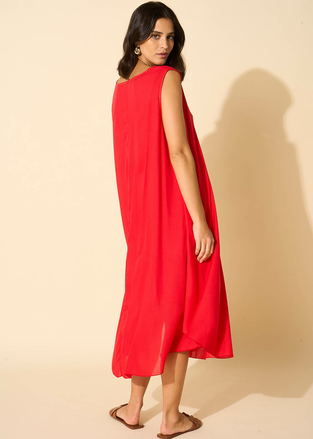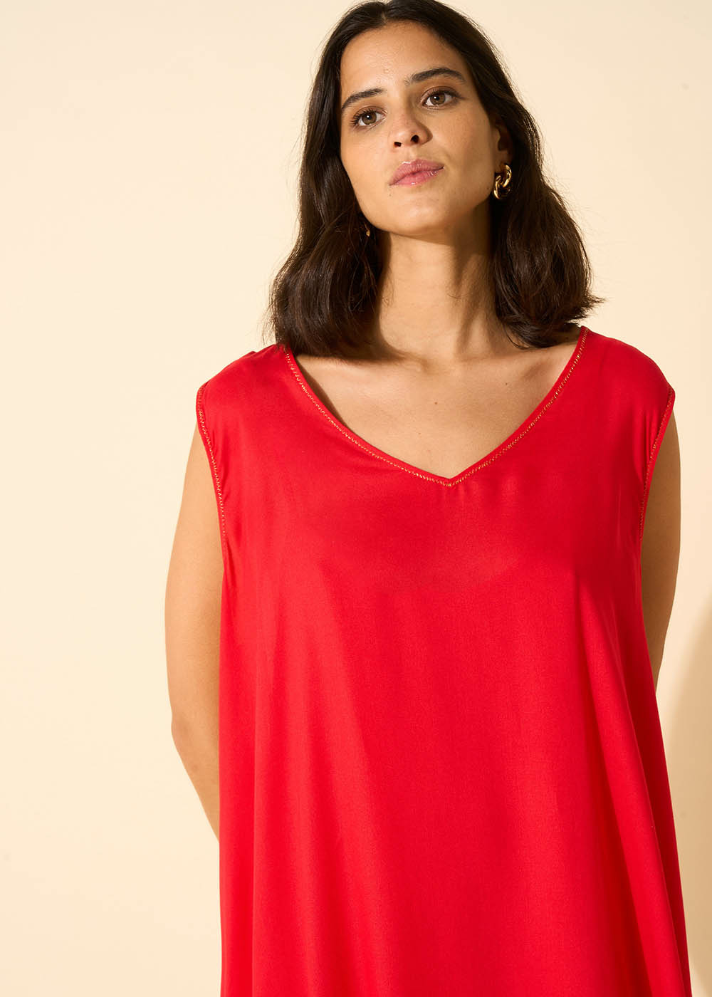 La robe RIMITI se caractérise par sa coupe midi, légèrement plus courte sur les côtés. Elle arbore un col en V et est dépourvue de manches, avec un fond de robe à bretelles intégré. Complétez votre tenue en l'associant à une paire de sandales dorées.