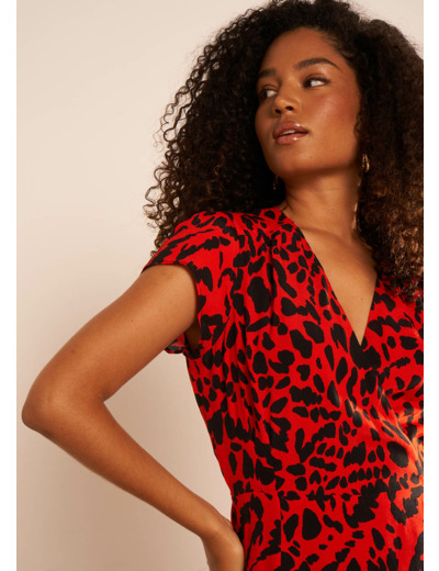 La robe midi RIXIES est pourvue d'un imprimé léopard rouge. Elle se caractérise par ses manches courtes et son décoletté cache-coeur. Complétez votre look en l'associant à une paire de bottes en cuir.